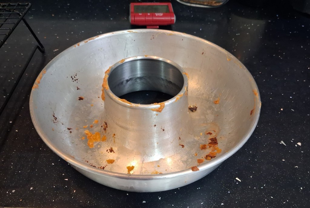1. Put the ring tin in the fridge for 30 minutes prior to making the cake. Then melt enough butter to brush the cold interior liberally. Return to fridge until it’s needed.