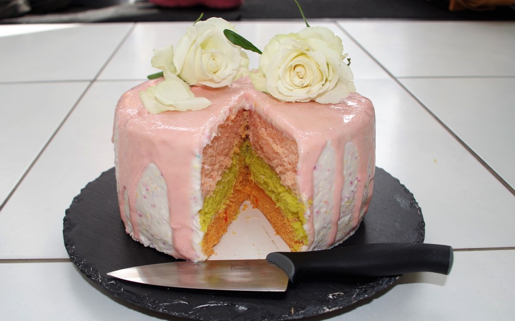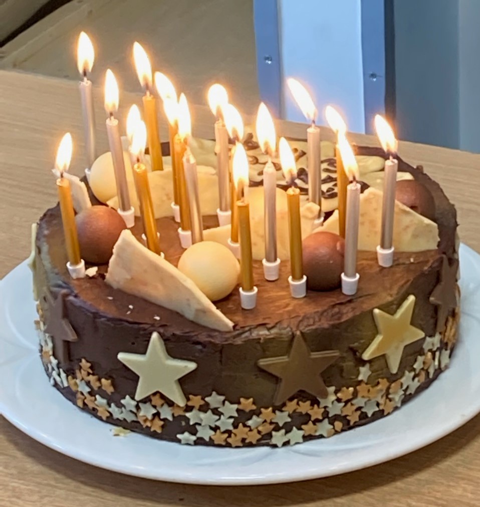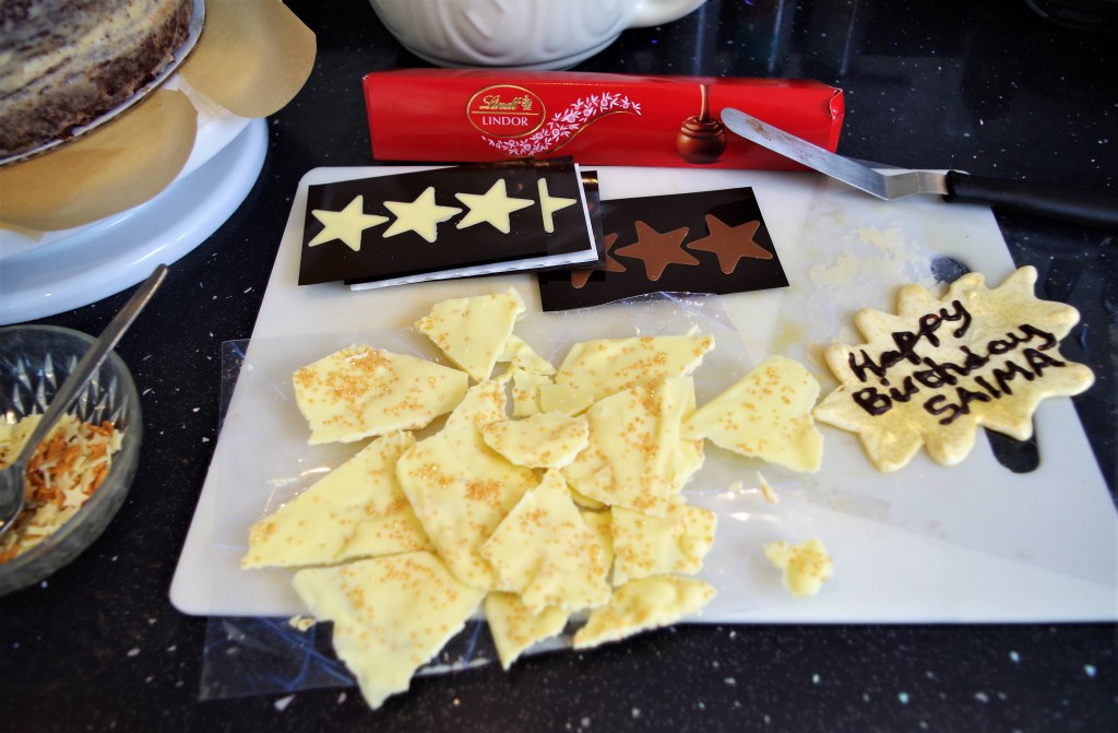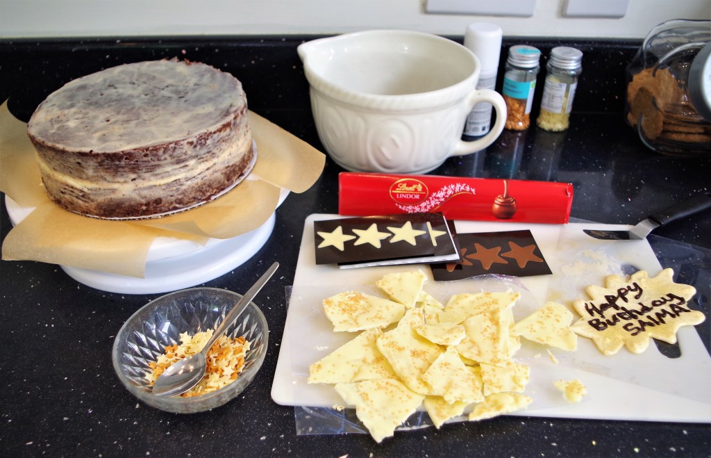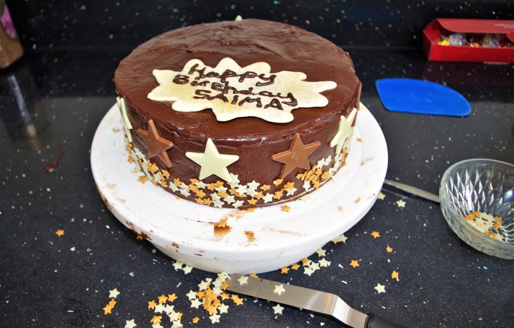 - A home-made white chocolate “plaque” + “Happy Birthday ????” piped on. (I did this because I wasn’t confident piping straight onto the cake, but it worked well.)