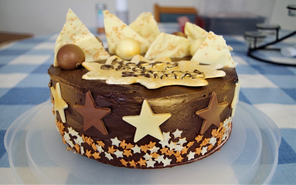 13. Add any further decorations of your choice. I like making decorations such as chocolate shards, but shop-bought chocolates work really well too. A gold or silver lustre spray gives a lovely finish.