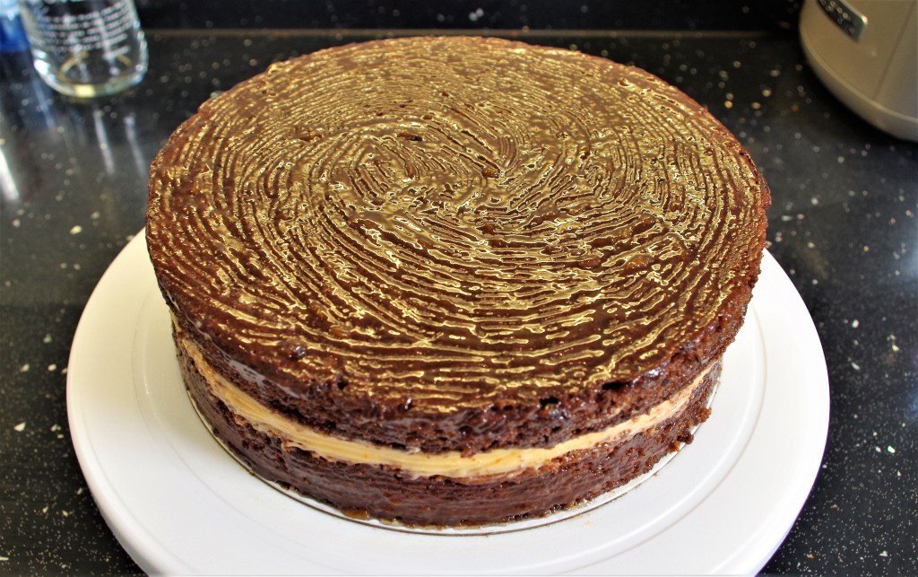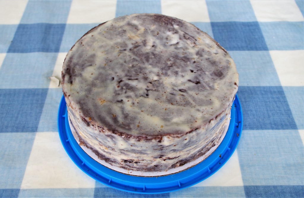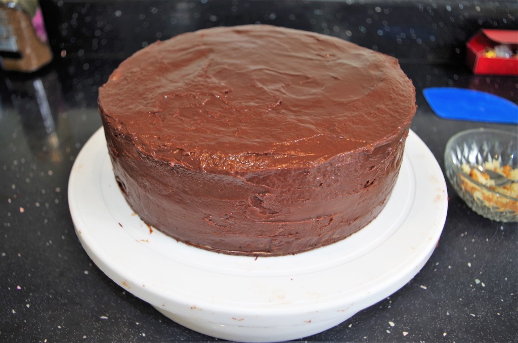 The day before ganaching and decorating, the cake needs to be sealed around the edges by brushing on warm apricot jam mixed with a small amount of water. A crumb coat is also helpful. I usually add a little milk to my “left-over” filling mixture and use that. Then the cake goes in the fridge for a while, ideally overnight.