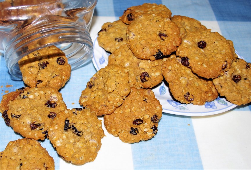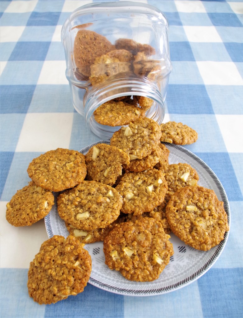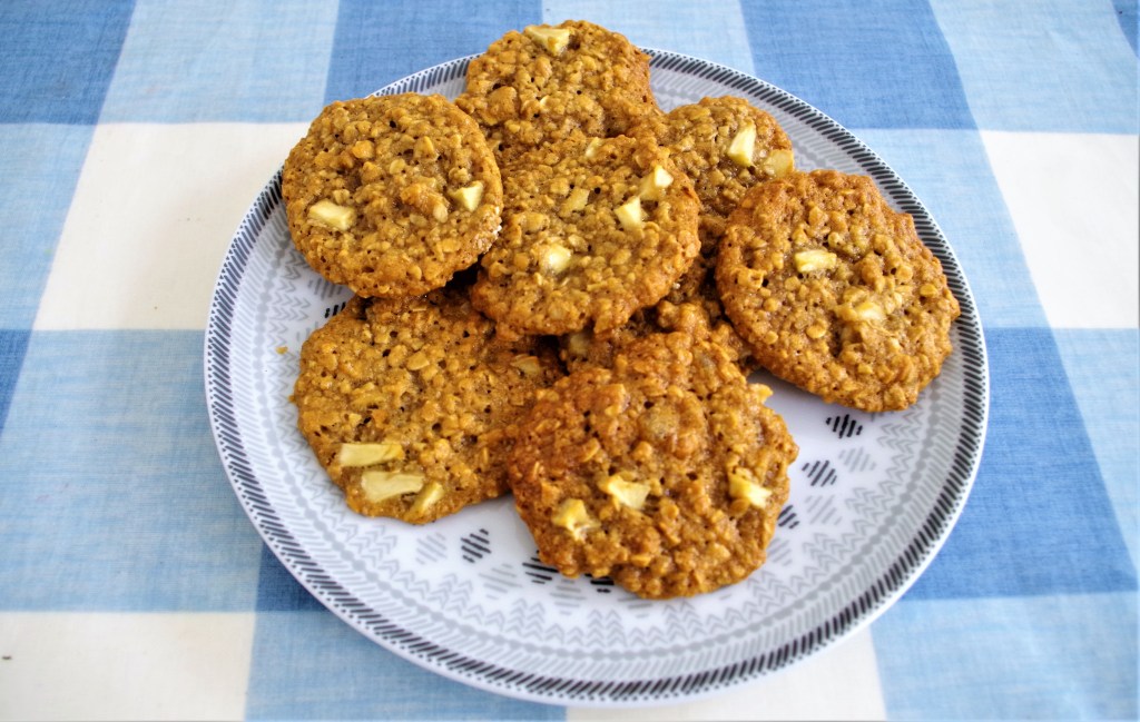 More recently I produced an Apple and Ginger version. Rather than create a whole new page I’ll put the ingredients below. It needed a little longer in the oven (15 – 18 minutes) due to the wetness of the apple. Also, with the addition of apple they won’t keep as long as cookies with dried fruit. (But in our house that’s not an issue.)