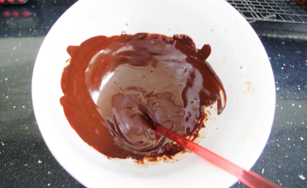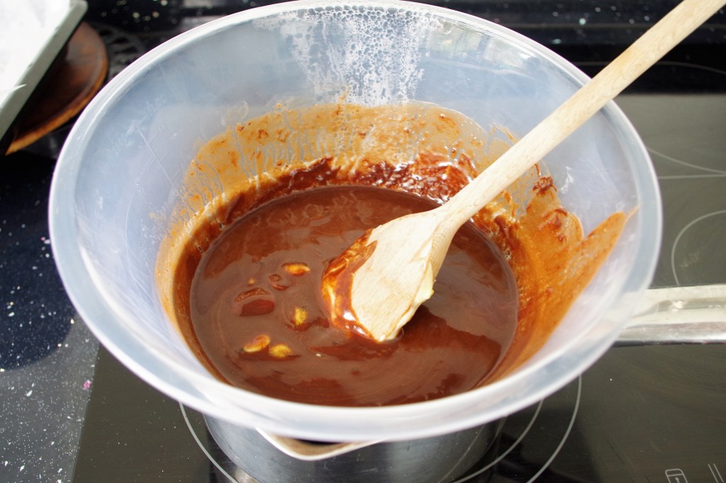 2. Melt together the butter and chocolate, either in a bain marie or use short bursts in a microwave, stirring regularly. Leave to cool a little.