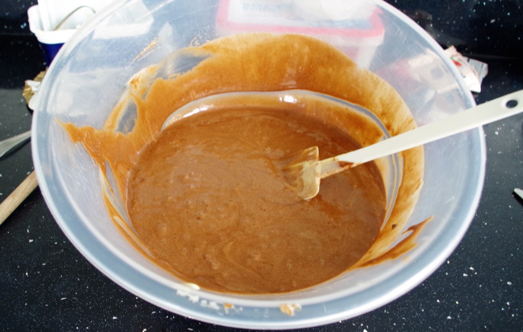3. In a large bowl, beat the eggs, almond extract and sugar together until thick enough to leave a trail. Gently fold in the cooled melted chocolate then sift in the flour, xanthan gum powder (if using) and cocoa powder. Then add in the coffee powder, ground almonds and salt. Finally, stir in the milk and chocolate chunks.