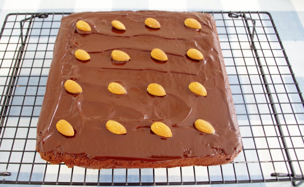 6. For the ganache, melt together the chocolate, butter and liqueur (or almond extract) and pour or brush it onto the top of the uncut brownie slab. Working quickly, before the chocolate sets, place the almonds so that there will be one in the centre of each brownie when cut. (Or sprinkle over the flaked almonds.)