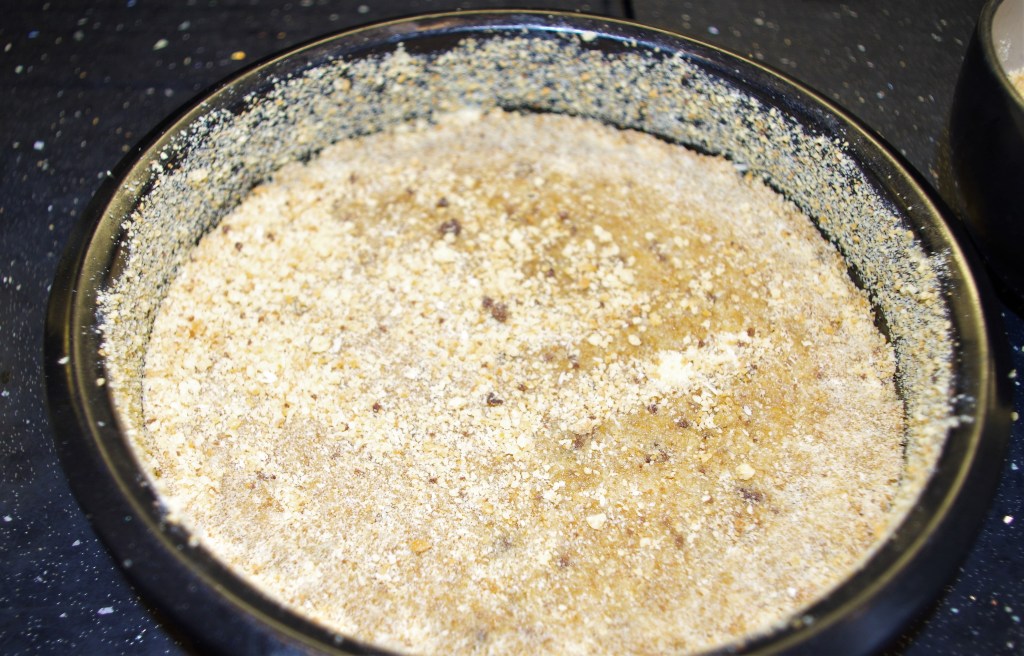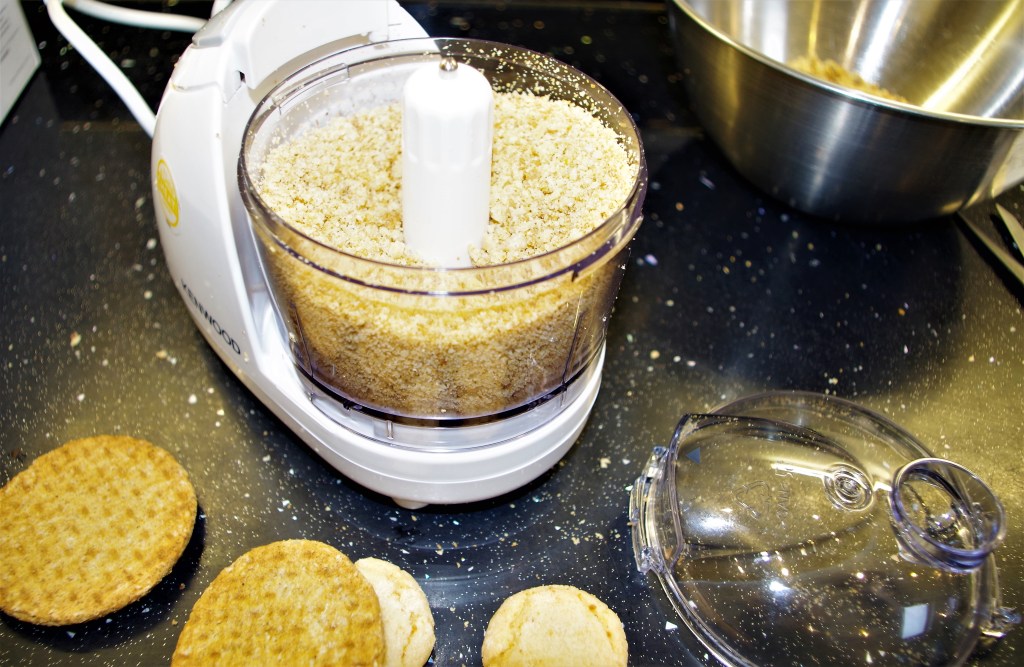 2. Whizz or bash all the biscuits until finely crumbled then stir in the ground almonds. Remove about 125g/4.5oz and set aside. Melt the butter and golden syrup in a saucepan then pour into the remaining biscuit crumbs. Stir well to coat all the pieces.