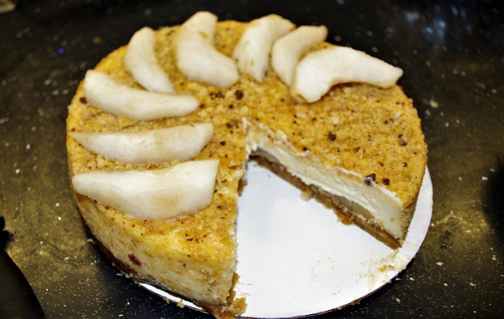 10. (Optional) The two extra pears, either poached or not, could be sliced and used to decorate the cheesecake. Be aware though, that this will wet the crumb layer, which might not be desirable. If, like below, your pear slices are very pale it might be worth removing them, sprinkling them with sugar and giving them a brief blast with a cook’s blow torch.
