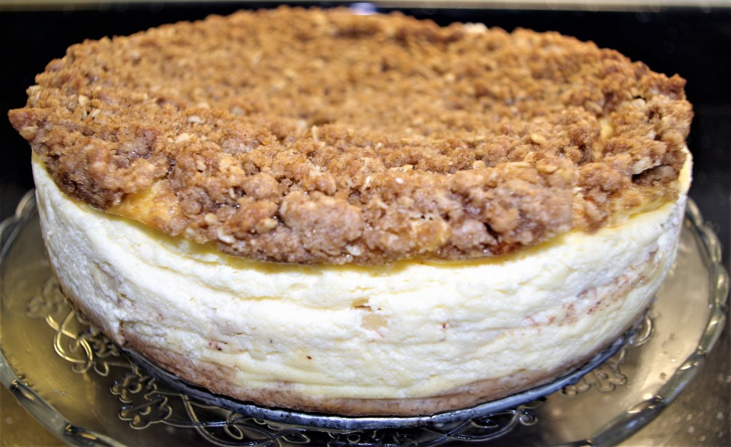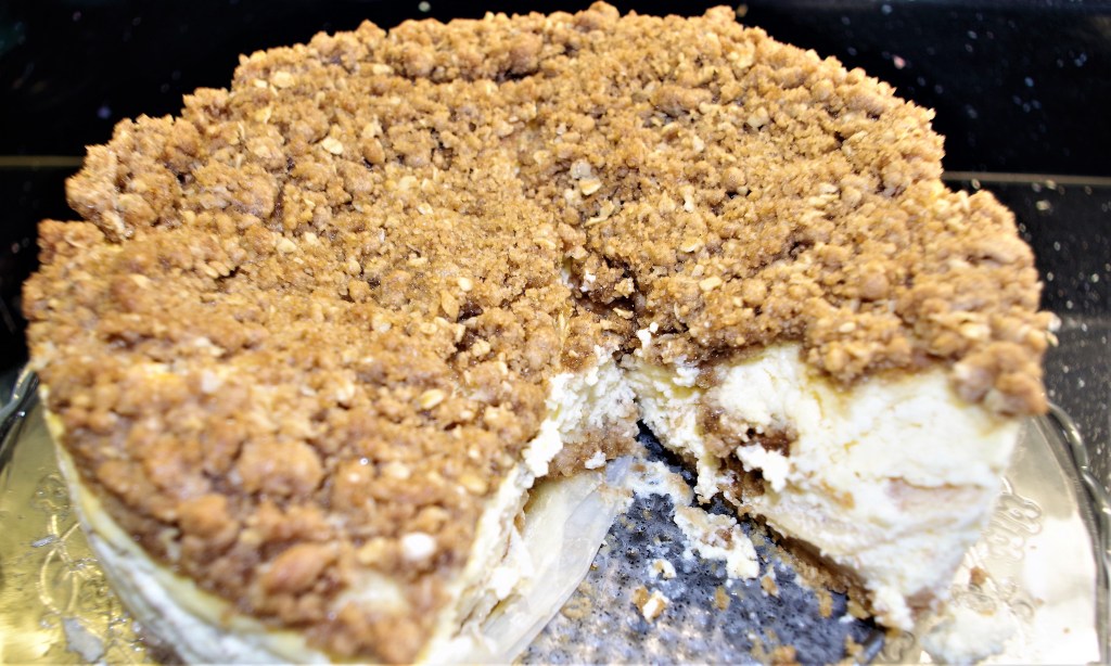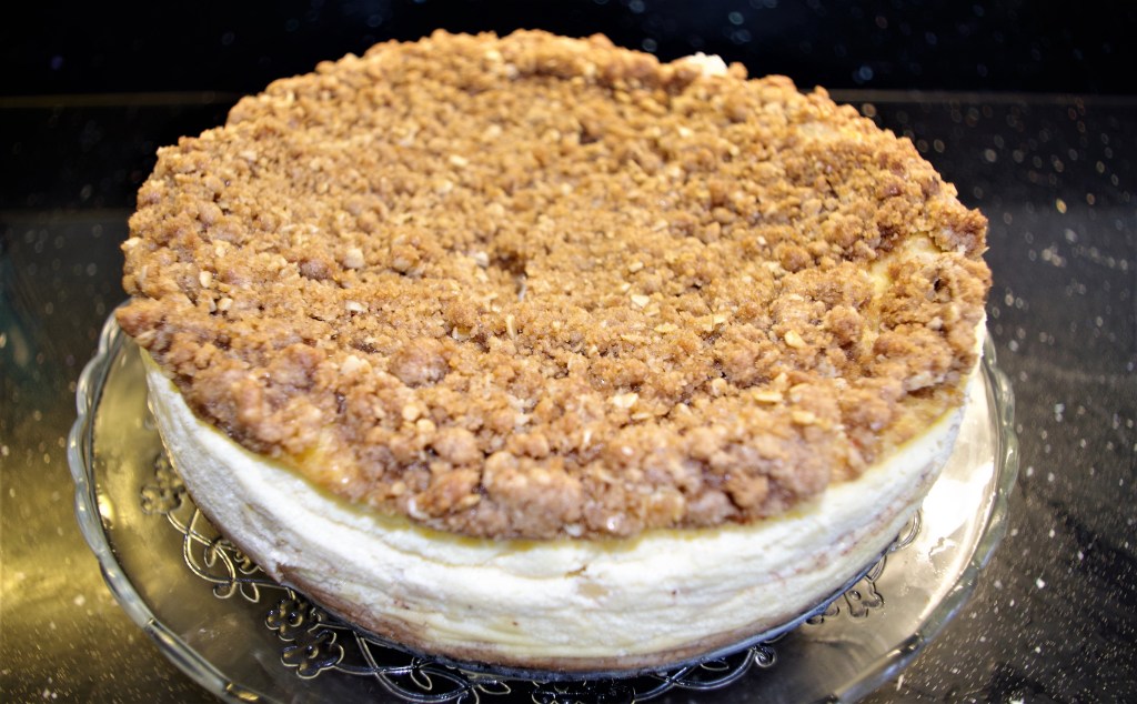 9. After 30 minutes, carefully open the oven door and sprinkle the topping over the cheesecake and bake for another 40 – 45 minutes. There should still be a bit of a wobble to the cheesecake when baked.