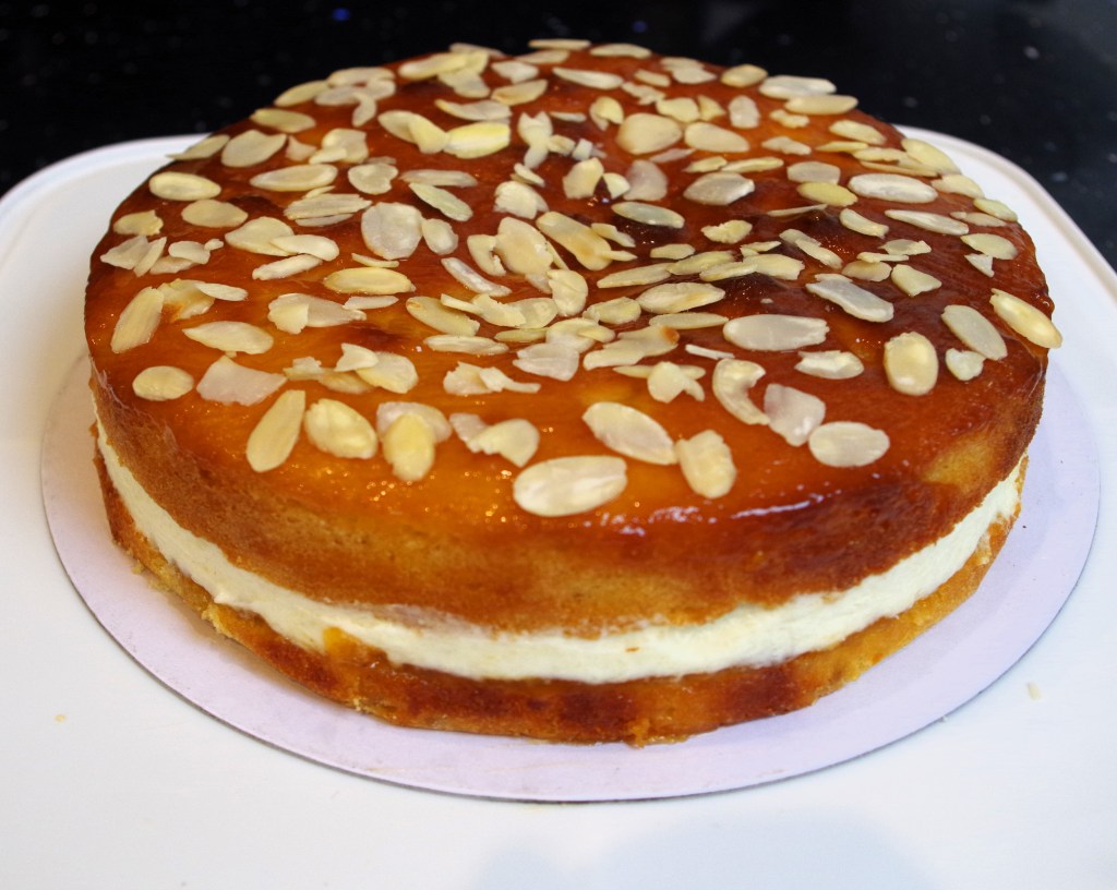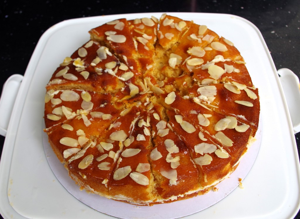 9B. …. Loosen 2 – 3 tablespoons of apricot jam with water or sherry and warm in the microwave. Brush this over the top of the cake and then scatter with flaked almonds.