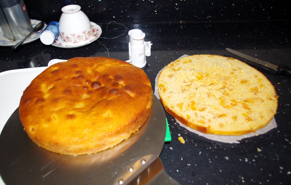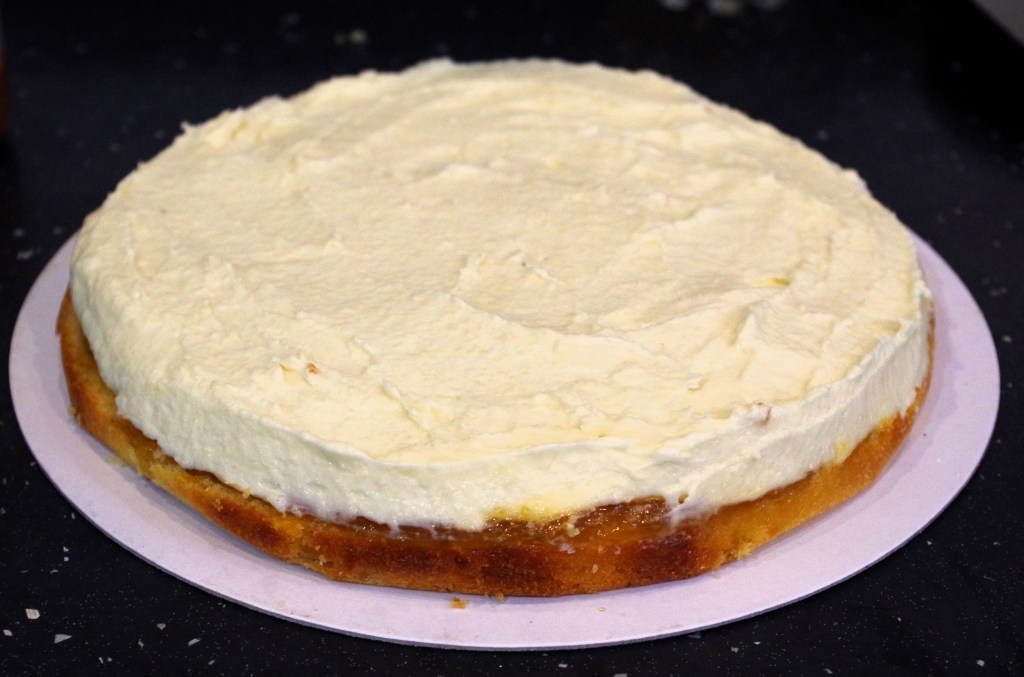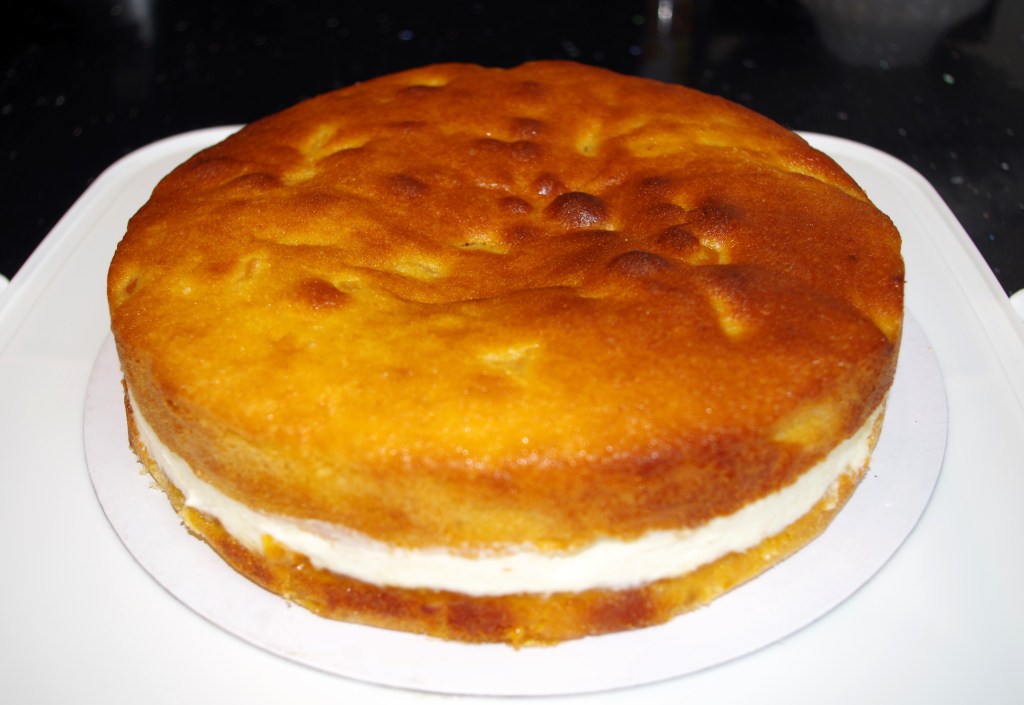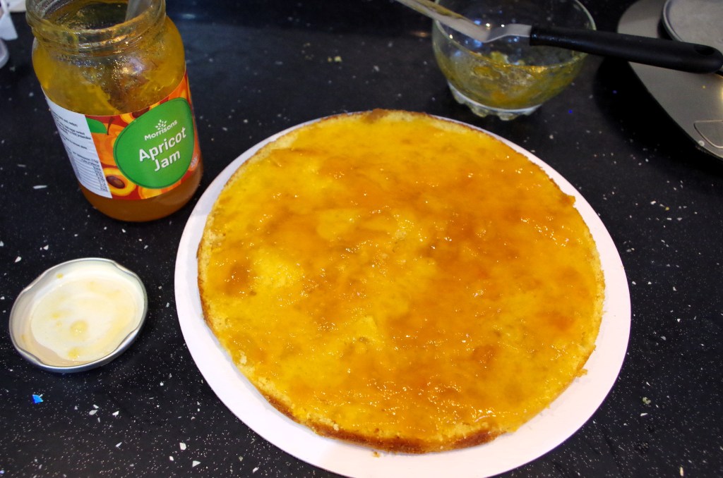 8. Cut the cake horizontally into two halves. Spoon over or pipe a coating of warmed jam then add the filling and carefully re-assemble the cake.