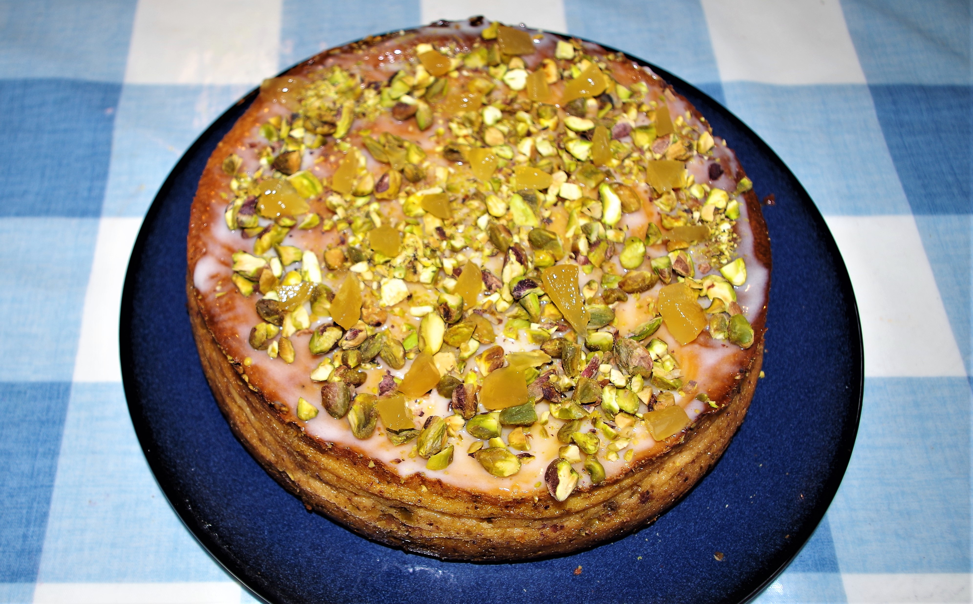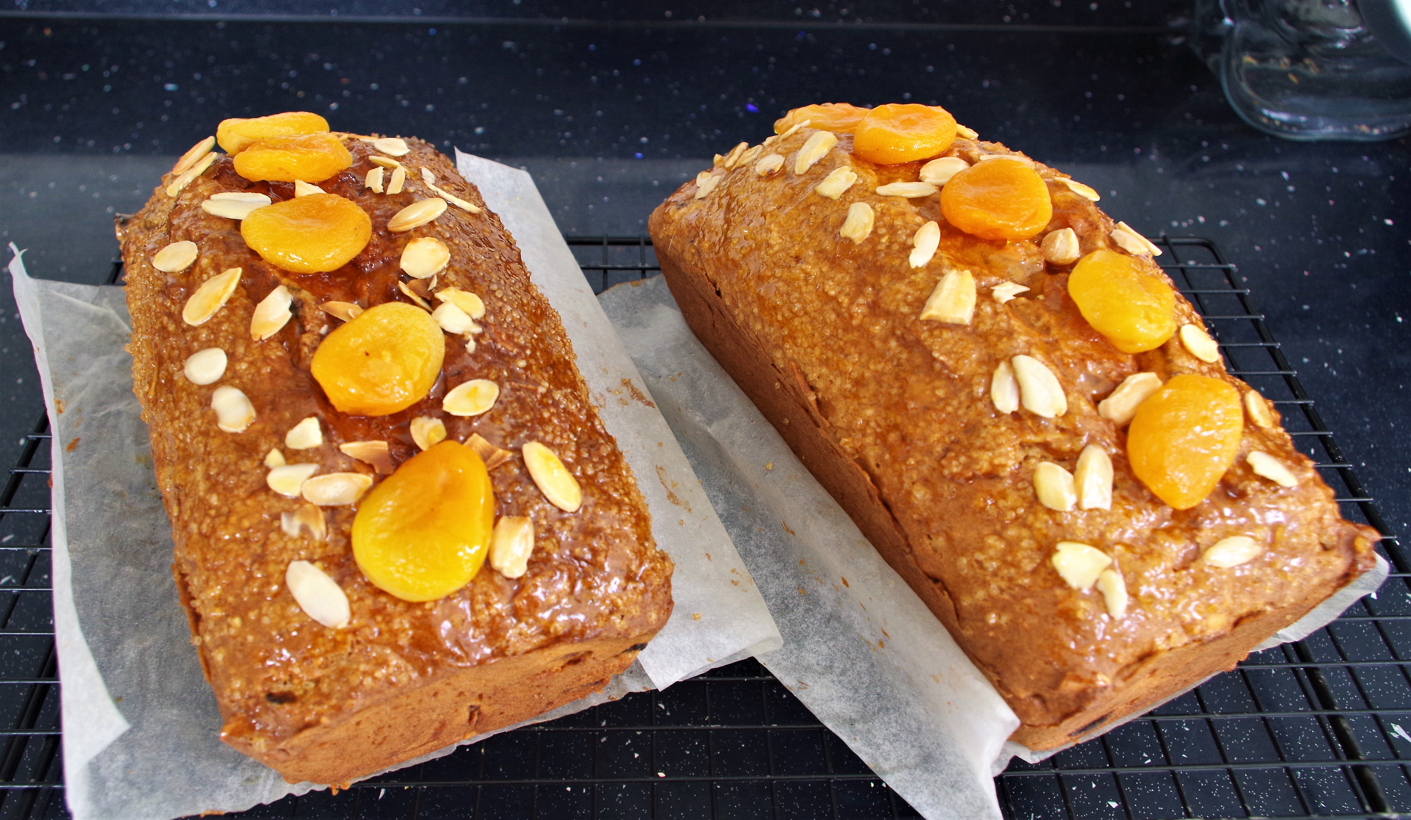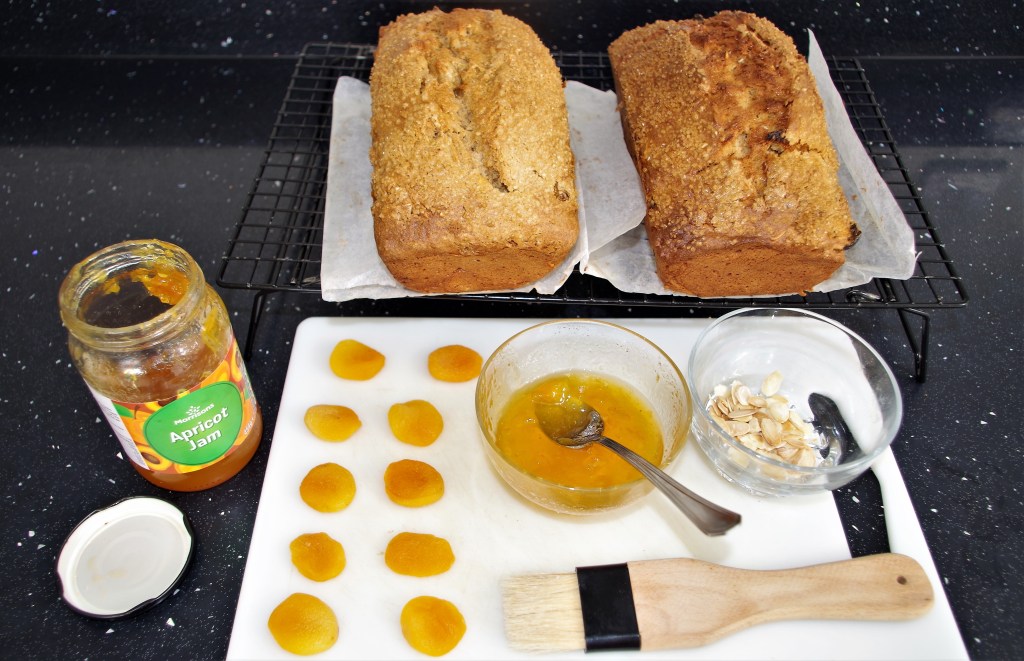 7. To decorate, brush top with warmed & sieved apricot jam and add the reserved apricot and almond pieces. Brush again with more jam.