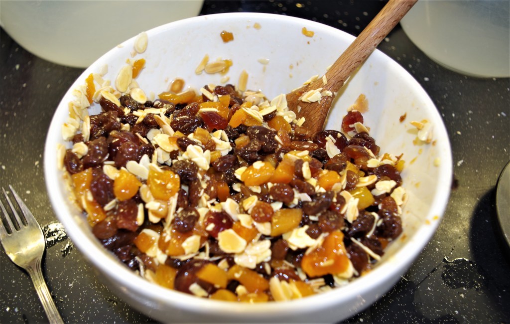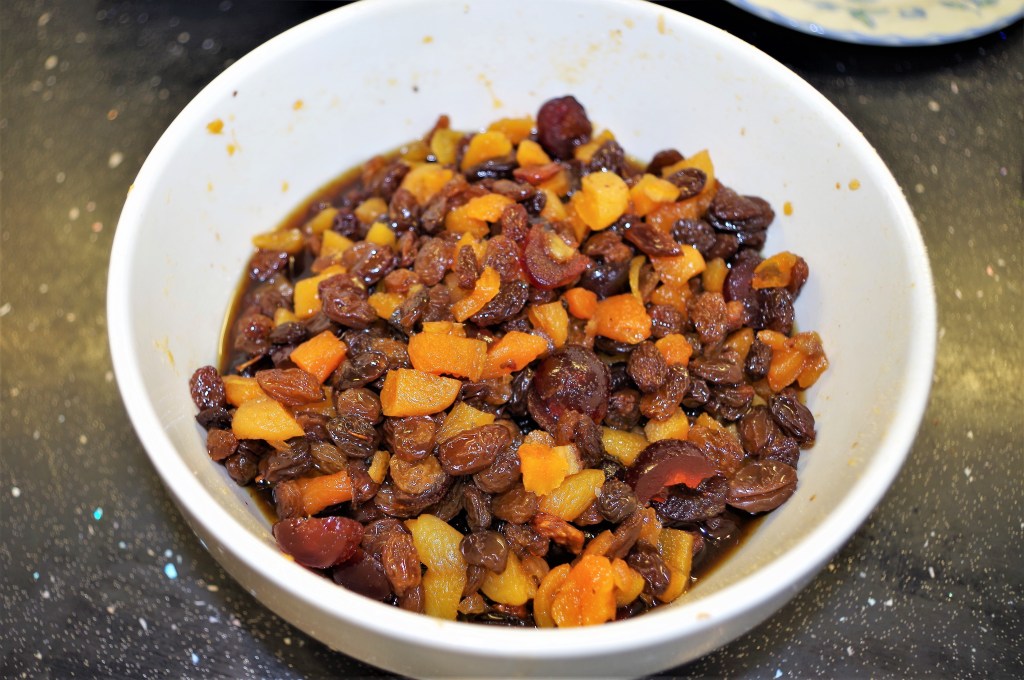 1. The night before: put the apricots, cherries, dried fruit, peel and sugar in a bowl and pour over a mixture of hot tea and sherry.