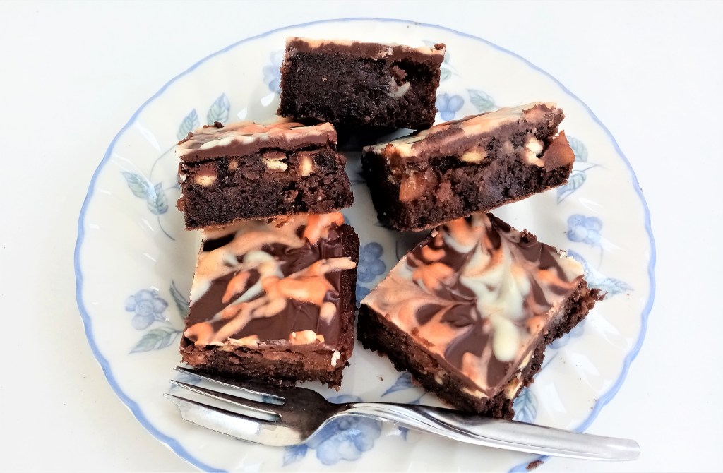 7. Pour or brush the melted dark chocolate onto the top of the uncut brownie slab. Before it sets fully, flick about half of the melted white chocolate over it randomly. Working quickly, mix a small amount of food colouring into the remaining white chocolate and flick that over the brownie slab. Use a cocktail stick to lightly swirl these colours into a pattern that you like. (Take care not to overdo this; it’s easy to get carried away.)