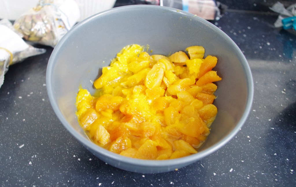 1. Prior to baking, put the chopped apricots in a small bowl and add the orange juice. Leave to macerate. (1 hour minimum, ideally overnight)