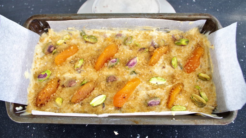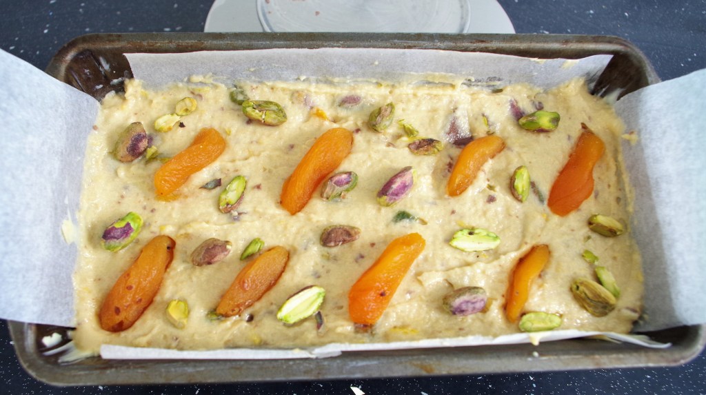 4. Spoon the mixture into the loaf tin and place the reserved apricot halves and pistachio halves on the top. Sprinkle over the demerara. (NB The apricots are very susceptible to burning. You could cover them with foil while baking or even leave them out and add on later.)