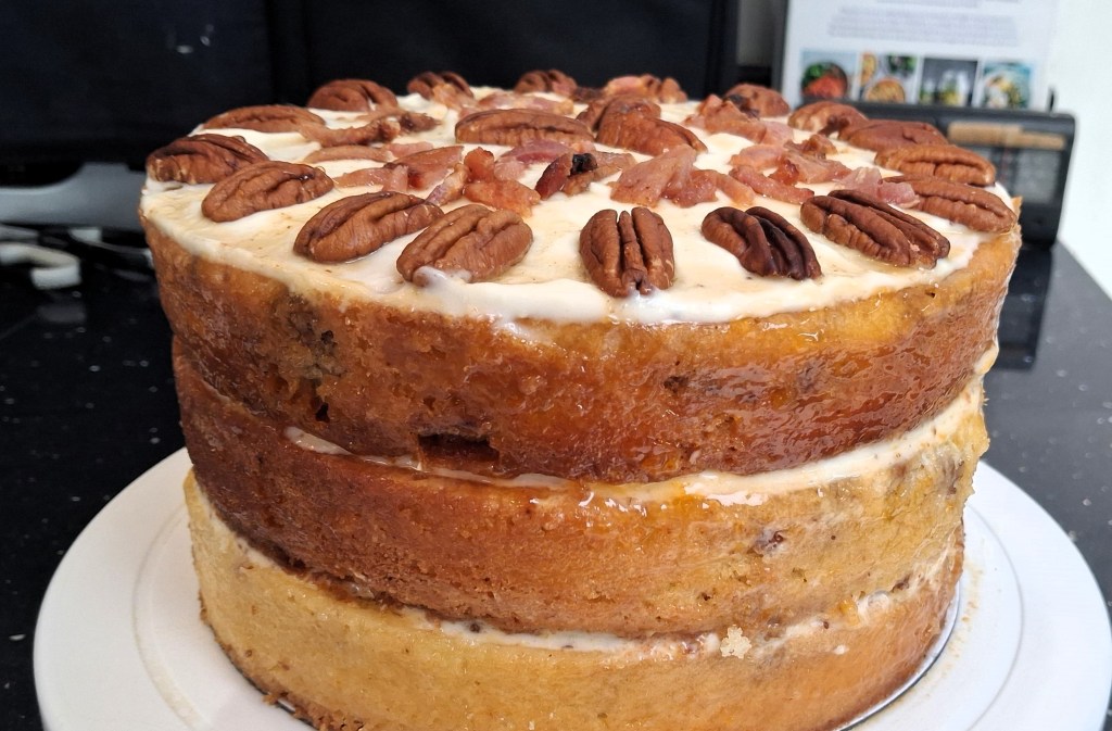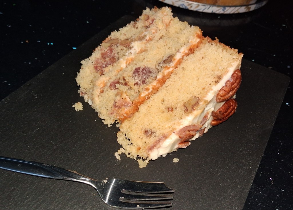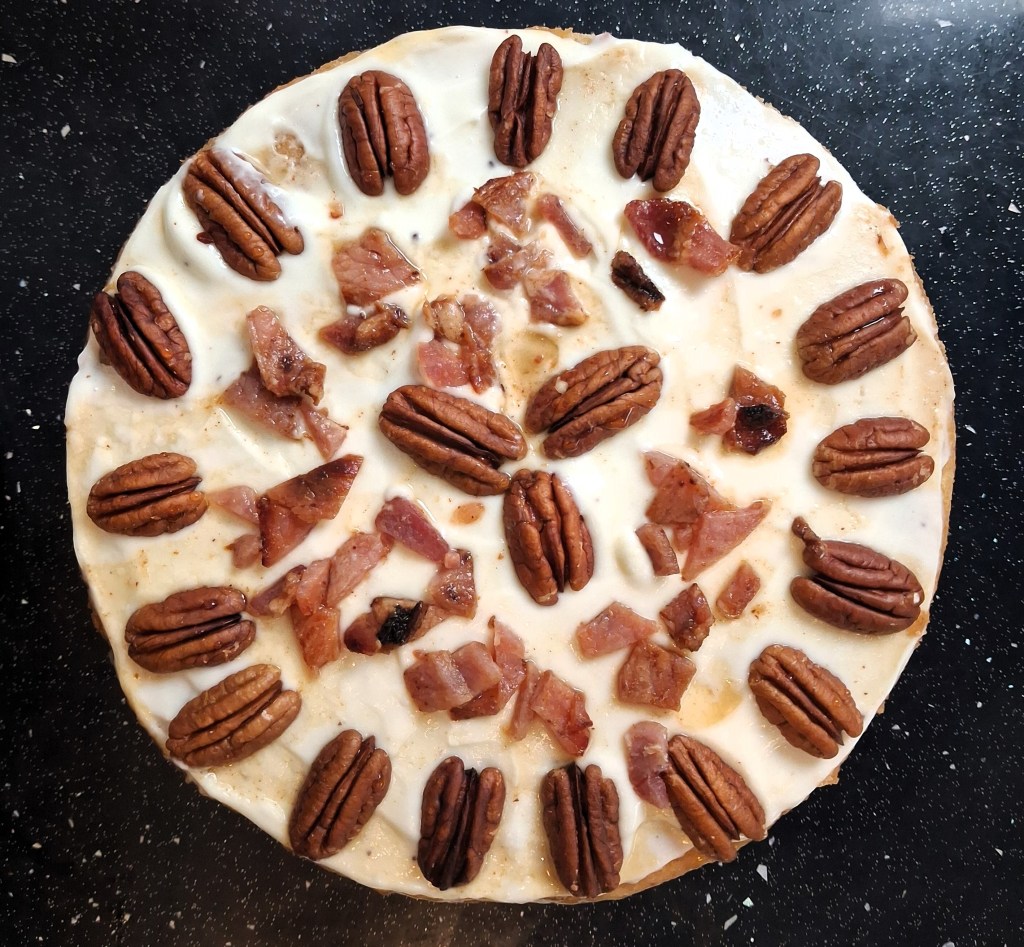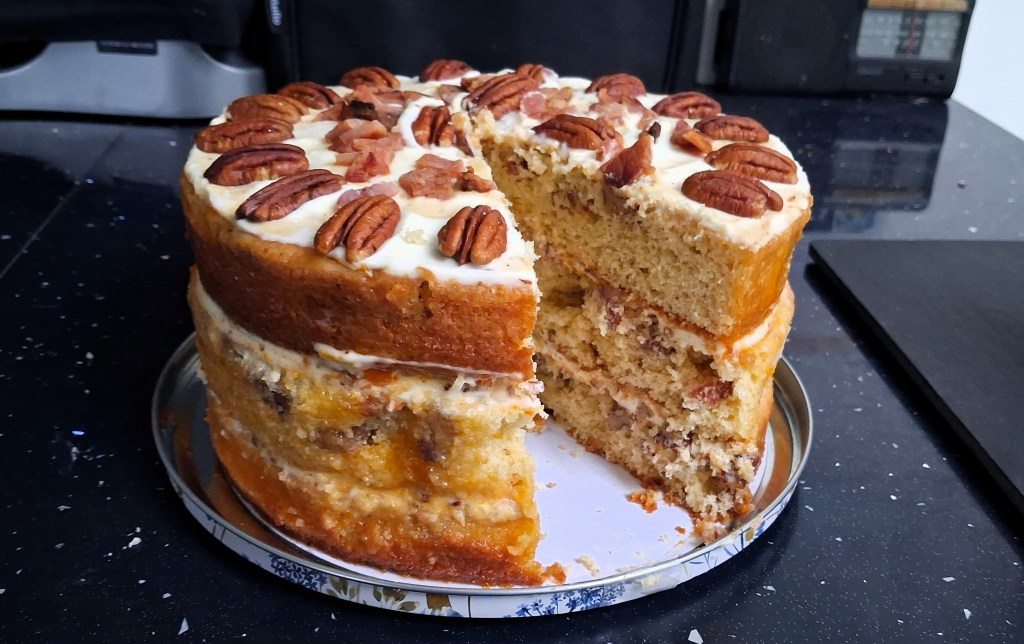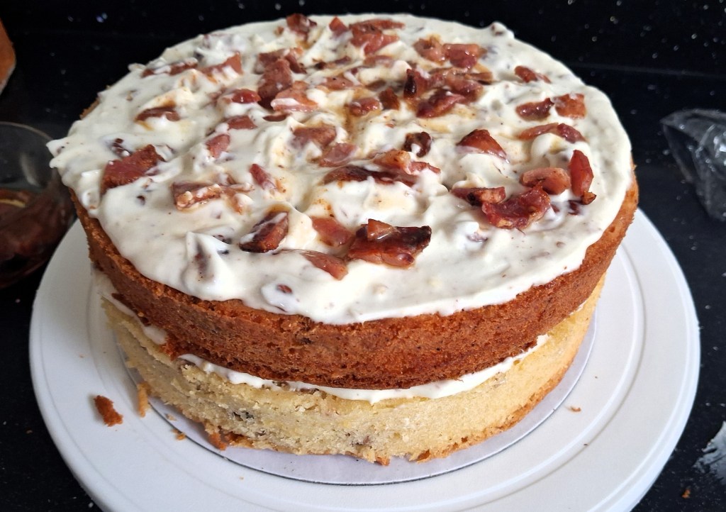 7. Level the cakes with a sharp serrated knife. Toss the remaining bacon and nut pieces in the reserved maple syrup. Use a third of the mixture with a third of the bacon and nut pieces* between each cake to stack them then finish off with the rest on top. If you have any maple syrup left over, drizzle it over the top as well. (* If you intend using pecan halves on top you could put all your smaller pieces between the two cakes as you won’t need any on top.)