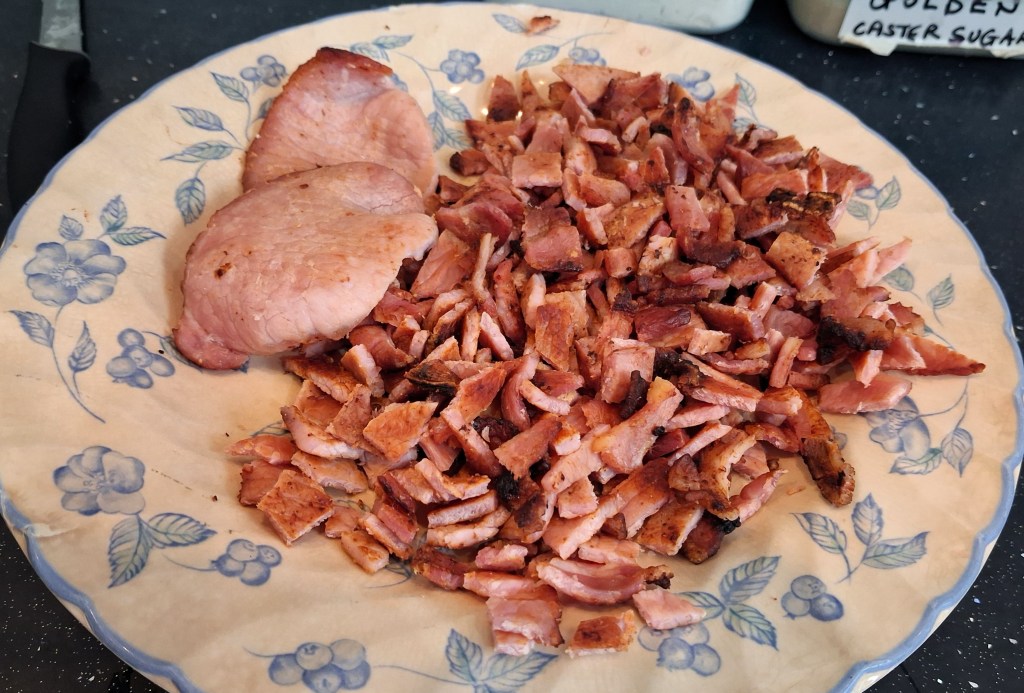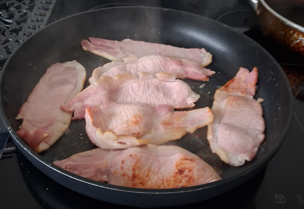 1. Cook the bacon until crispy, either under a grill or in a dry frying pan. Dab off any oily residue with kitchen paper. When cool, cut the bacon into small pieces and set aside.