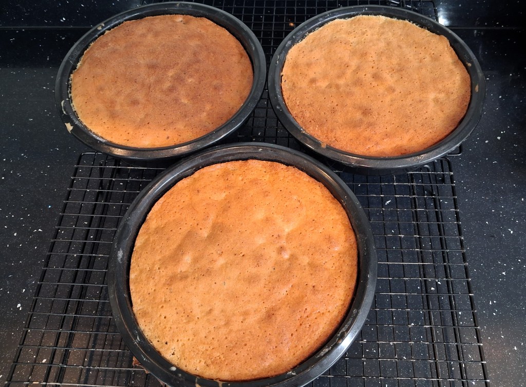5. Divide the cake mixture equally between the three tins and bake for 25 – 35 minutes, until a skewer inserted into the middle of the cakes comes out clean and dry. Leave the cakes in the tins for 10 minutes then turn out onto wire racks to cool fully.