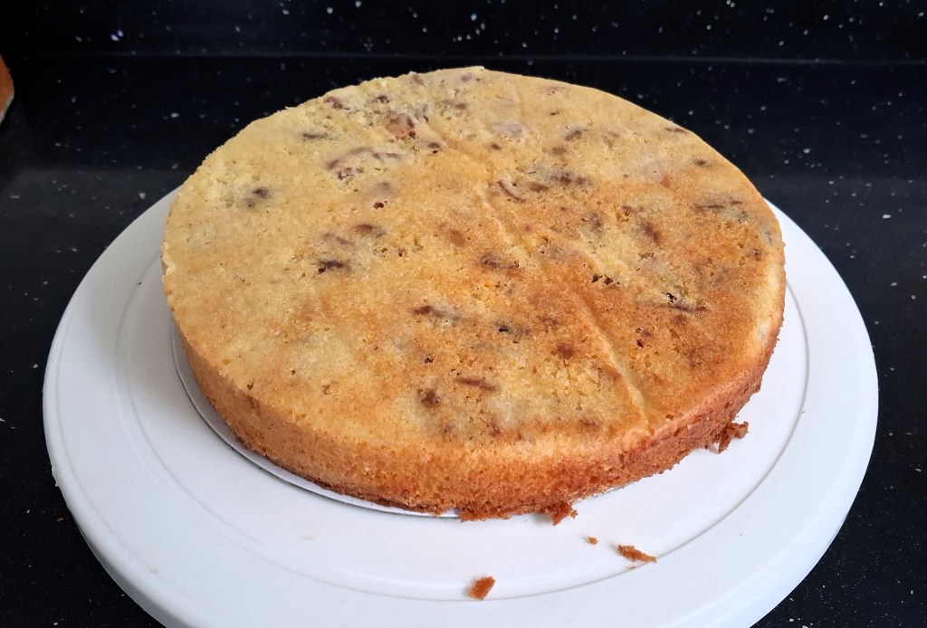 Although all three cakes were fully baked together their colours varied. For me, that wasn’t a problem with a cake I was sharing with friends at church, but if this happens for you and you’d like to cover it up, make more filling and use it to cover the sides.