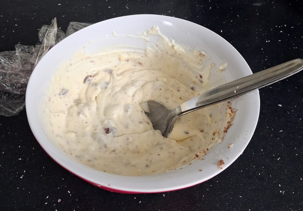 4. Stir in most of the bacon and nut pieces. (Retain about a quarter – some will be used when layering the cake, some will go on top. And/or, reserve a few pecan halves to use on top.)