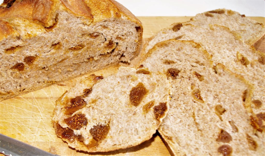 This loaf has an unusual but excellent combination of ingredients and flavours. I’m embarrassed to admit that it came about simply by looking around the house for likely items – the fridge (bacon), the cupboard (walnuts) and the garden (parsley & chives). Not quite foraging, but it worked.