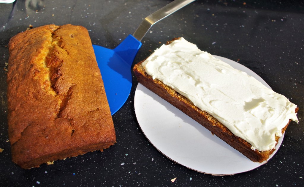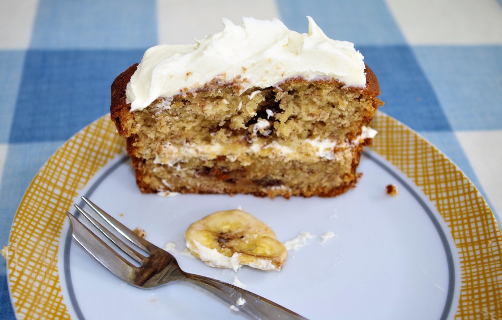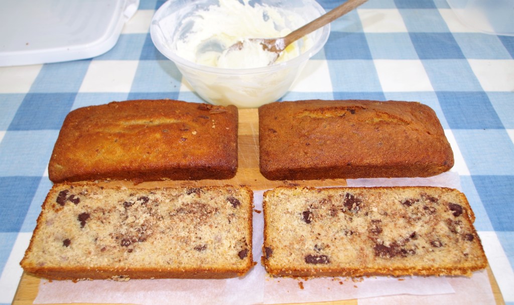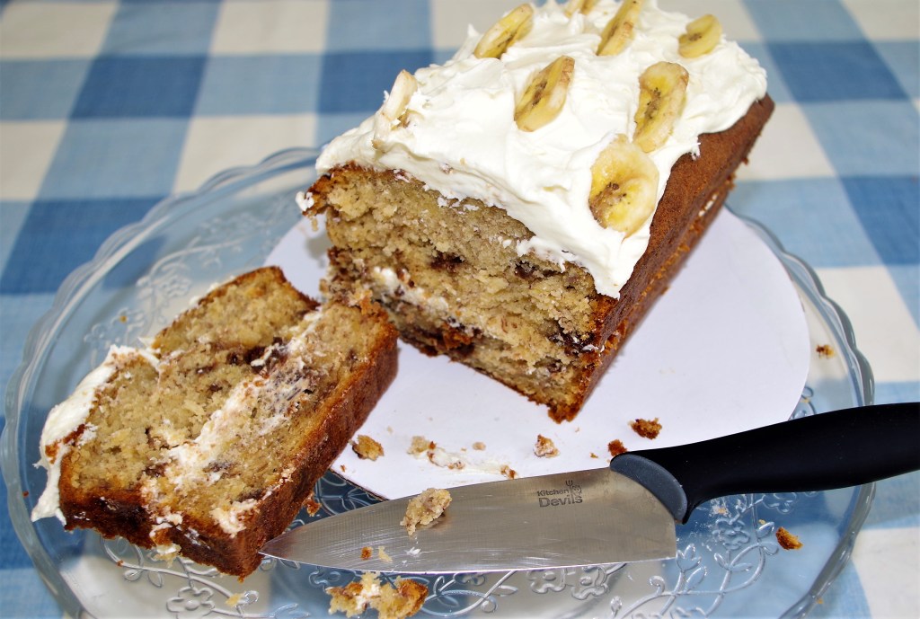 I was given quite a few “well-past-their-best-by-date” bananas recently so I decided to create a loaf cake with them, but wanted a bit more “umpth” so added milk chocolate pieces. Then I thought, why not make a delicious filling and topping. My “go-to” white chocolate buttercream was the obvious answer. All in all it’s a lovely, luscious, quick and easy cake. Actually, I had enough bananas to make three cakes as you can see below.