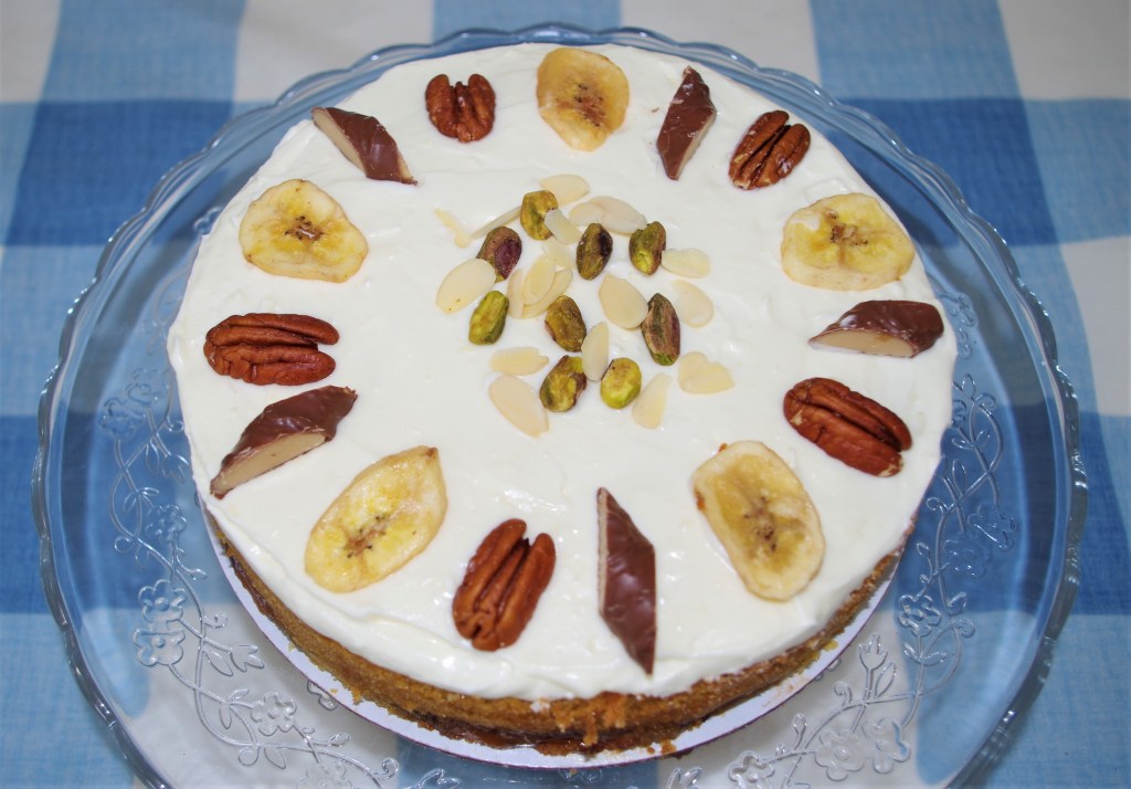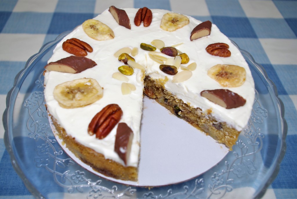 Here’s a lovely easy cake with a terrific taste and a great range of textures including crunchy nuts, chewy fudge and squidgy pieces of banana, all of which combine and complement each other wonderfully well.