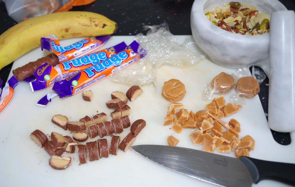 - 100g/3½oz – 125g/4½oz pre-bought fudge cut small (I used choc fudge bars)