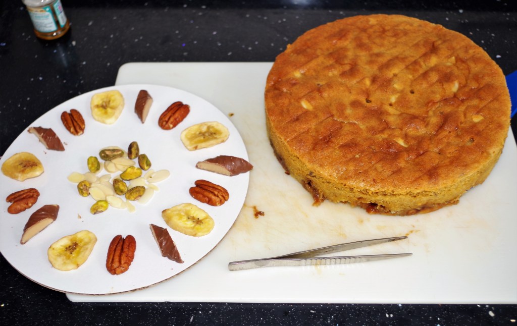 7. Spread or pipe the topping over the cake and add the freeze-dried banana chips plus any reserved nuts and fudge pieces.