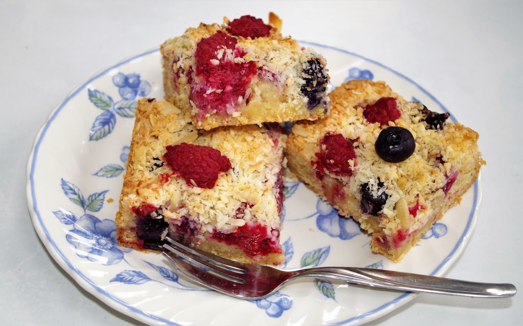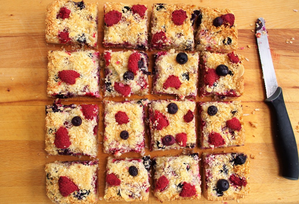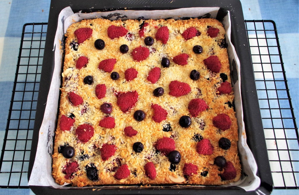 5. Spread the main mixture in the tin and scatter with about two-thirds of the berries*. Sprinkle over the reserved coconut mixture and bake for 40 – 45 minutes. Check towards the end in case the coconut is getting too dark. If so, cover with foil.