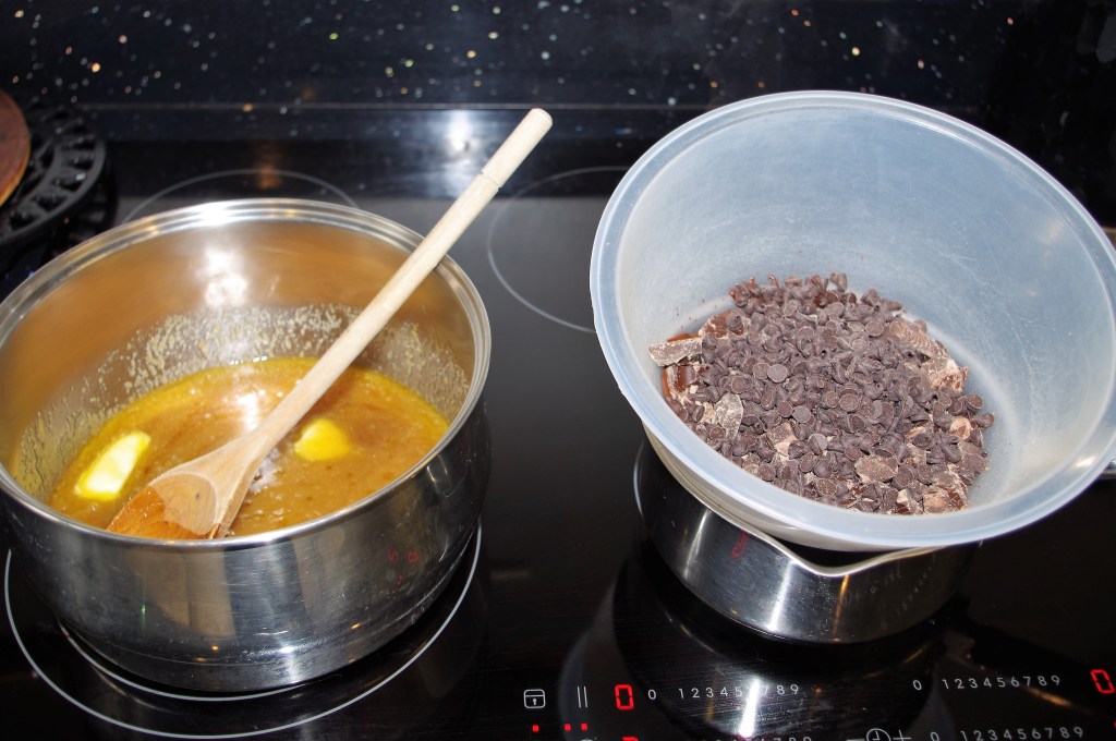 4. Put the chocolate into a bain marie on a low heat. While it’s melting, put the butter, sugars and golden syrup into a large saucepan and gently melt. Stir well to make sure all the sugar dissolves.