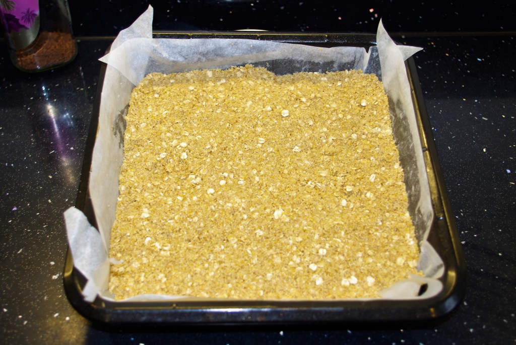 1. Butter & line the tin. Melt the butter and golden syrup, taking care not to let it reach boiling point. Mix together the dry ingredients*. Pour the melted butter onto the dry ingredients and stir well to coat it all.
