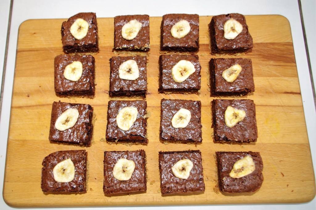 10. Turn out the slab and use a sharp knife or a metal dough scraper to cut it into pieces, or cut it while still in the tin and remove piece by piece. Attach a banana chip on top of each brownie – use a small “dab” of melted chocolate or golden syrup to “glue” them in place.