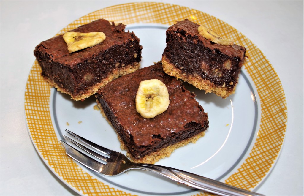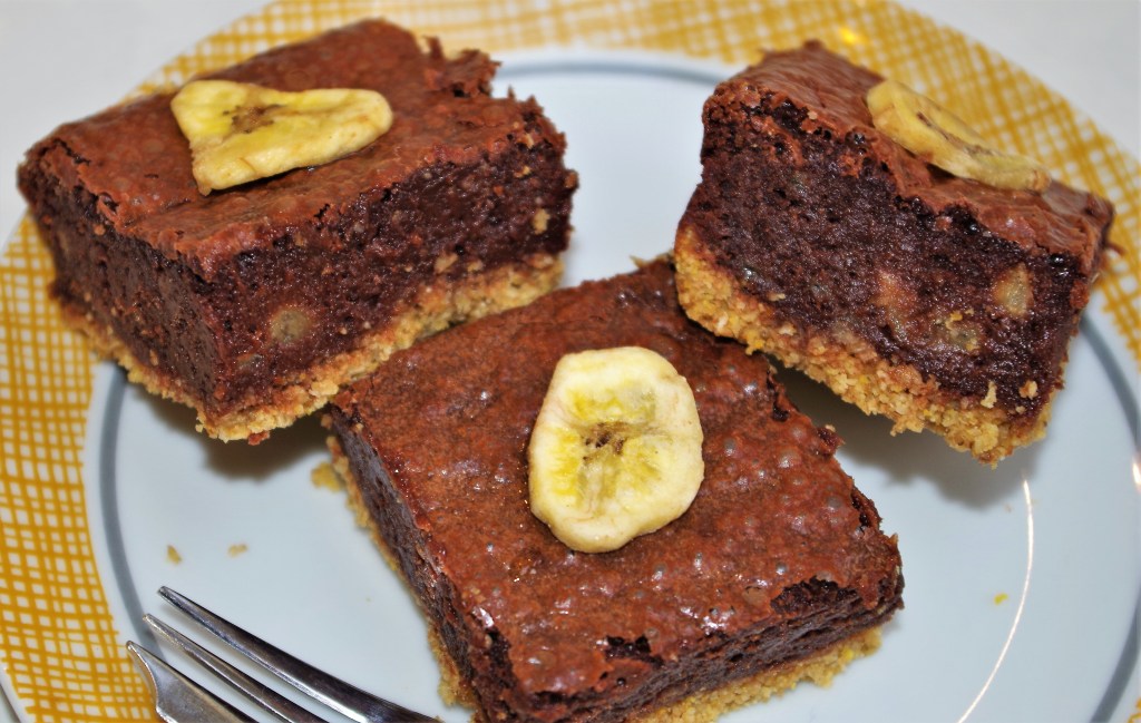 This is one of the best, most delicious brownies that I’ve ever made – and I’ve made a lot. It’s dense and fudgy with a rich chocolate and banana flavour combination. The biscuit base adds an extra dimension. And I get the chance to indulge in a bit of alliteration. I had to hold myself back and not preamble the title with adjectives such as “brilliant” or “beautiful”. I’ve even made it as a gluten free bake, but it’s OK if you don’t want to go down that line, I’ve given alternative ingredients.