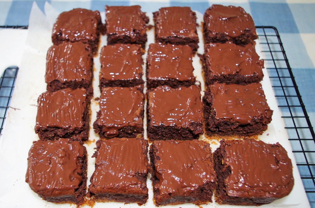 10. Turn out of the tin, remove the paper and trim the edges off the brownie. Using a sharp knife or a metal dough scraper, cut it into pieces. (Or, cut it while still in the tin and remove piece by piece)