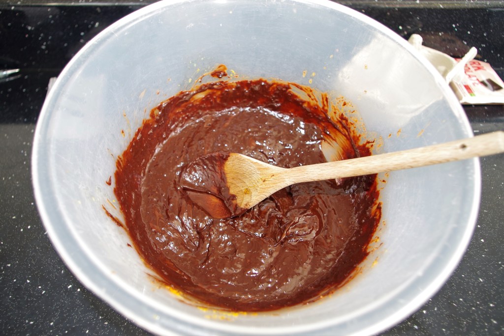 7. In another bowl, whisk the eggs and orange extract (if using). Pour into the chocolate mixture and beat again. Now sift on the flour and salt. Fold in with the candied peel.