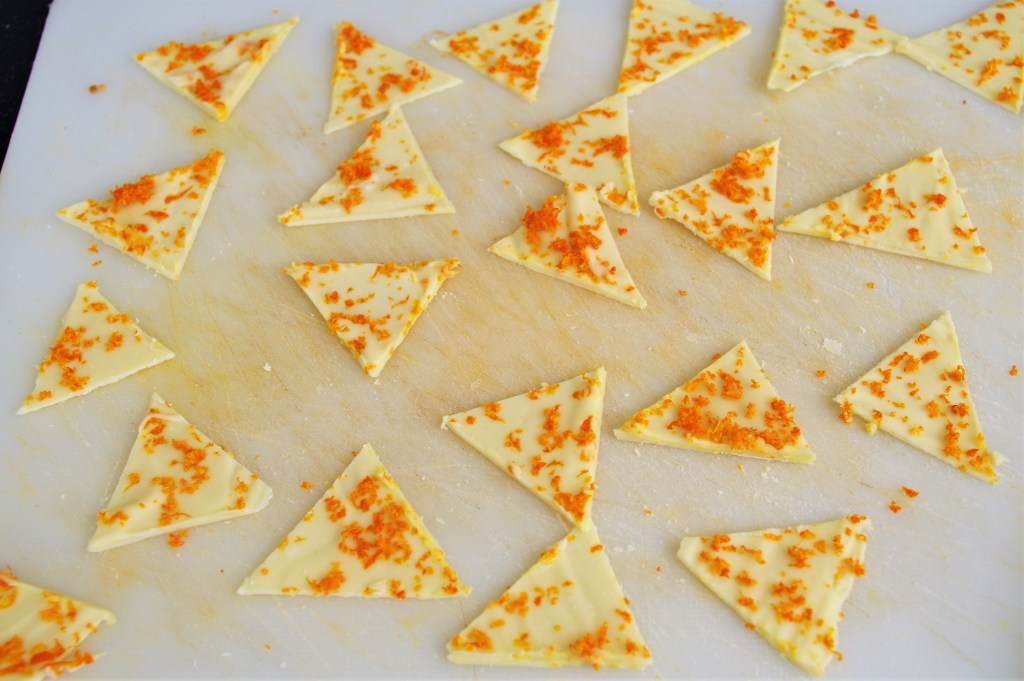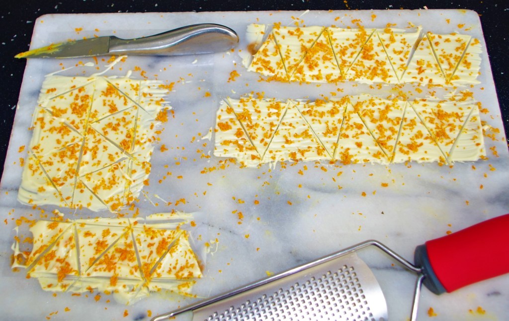 13. Before it sets, grate over the zest of an orange or a Satsuma (which tend to be a brighter orange colour). When the chocolate has almost set, mark it into triangles with a sharp non-serrated knife. Chill in the fridge then break gently into pieces.