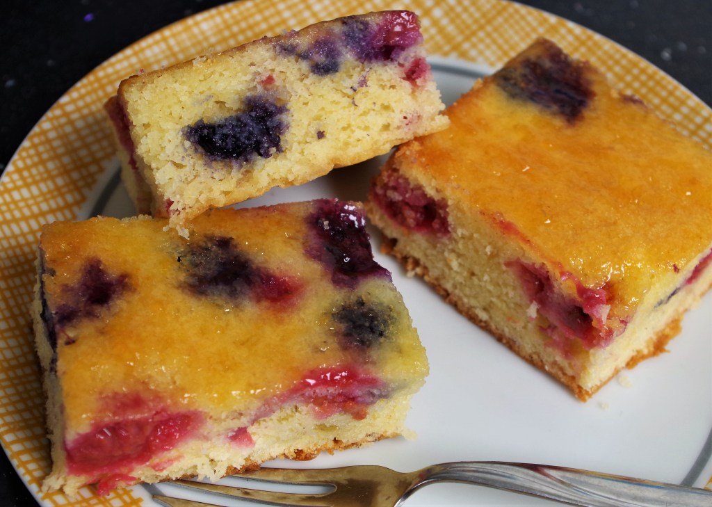 10. Bake for about 25 – 30 min, until risen at edges but still squidgy in the middle. Allow to cool then cut or half cut into pieces. (If it’s too squidgy to cut, put it in the fridge for about half an hour to firm up.)