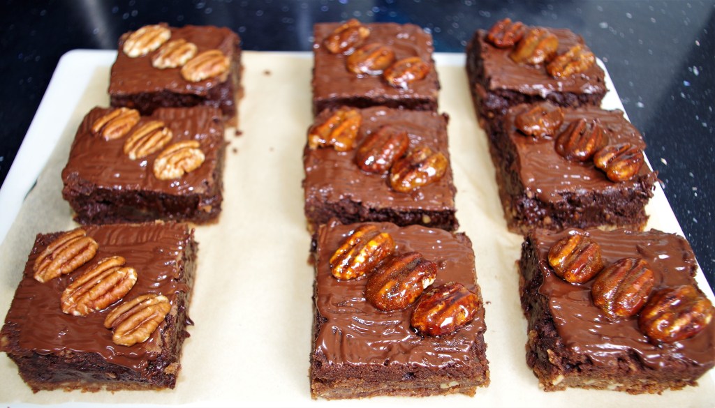 11B. To decorate, melt the dark chocolate, butter and golden syrup over a bain marie. Complete the cutting process then brush on the melted chocolate mixture and add 1, 2 or 3 pecan halves to each piece.