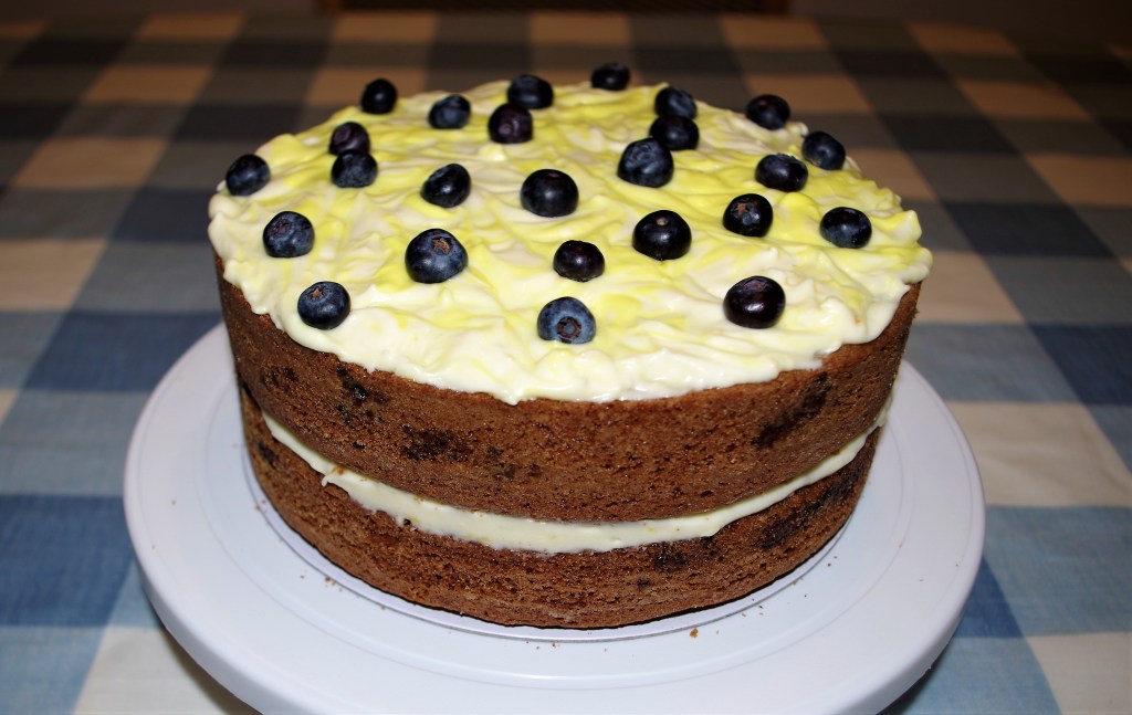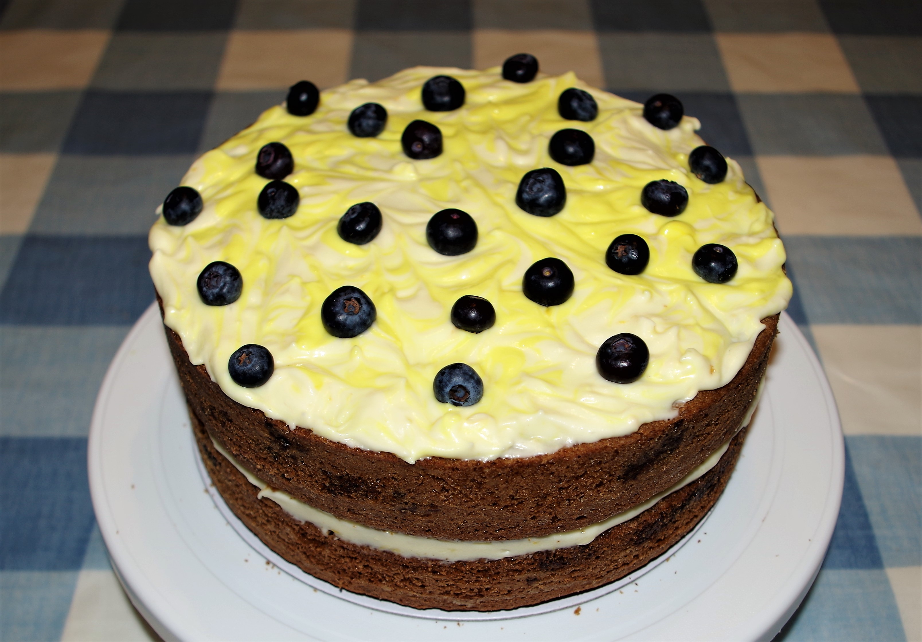 6. Use half this mixture to combine the cakes and the rest to cover the top*. Add the remaining blueberries to decorate.