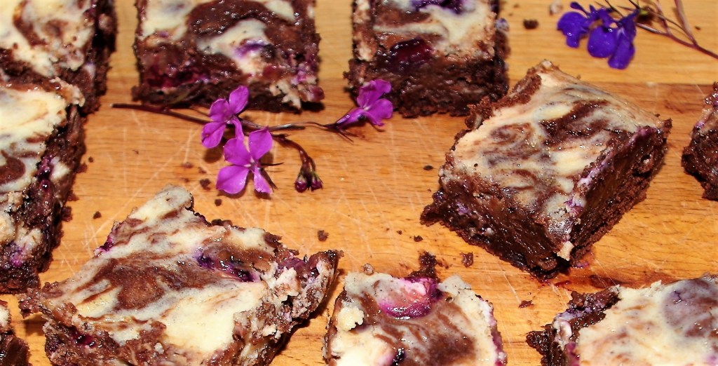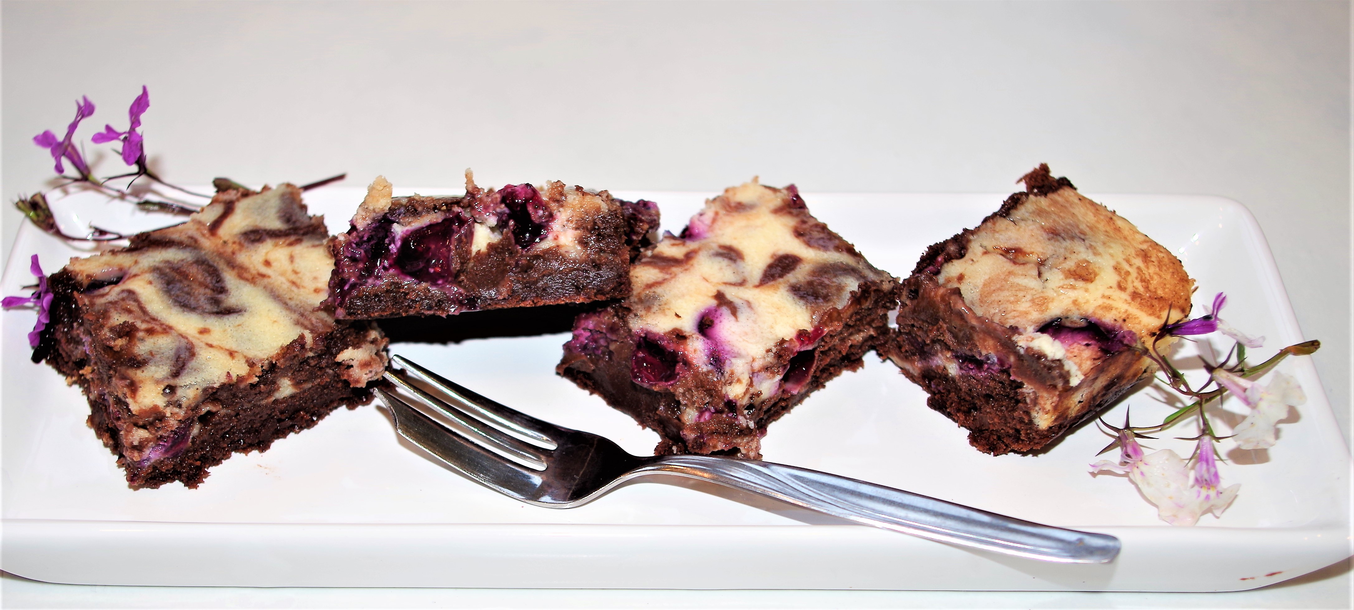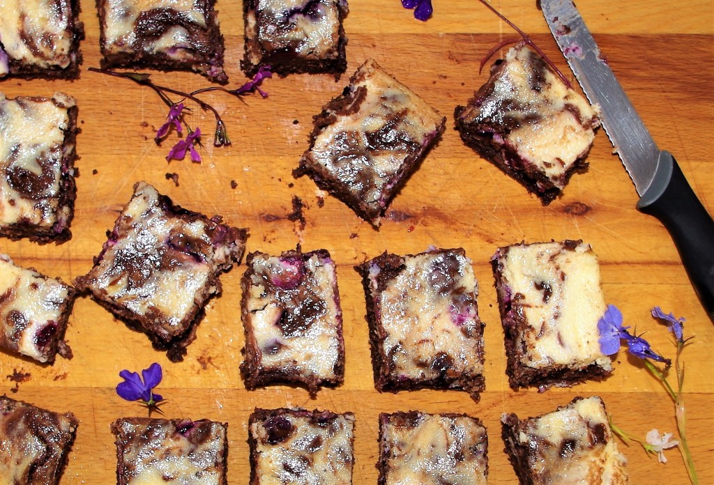 As with all good brownies these are rich, gooey and very chocolaty (of course), but they also have the creamy smoothness of cheesecake and the tangy moistness of blueberries. What a combination.