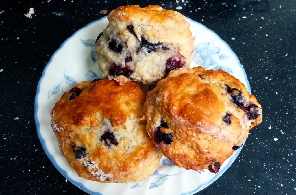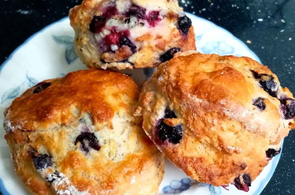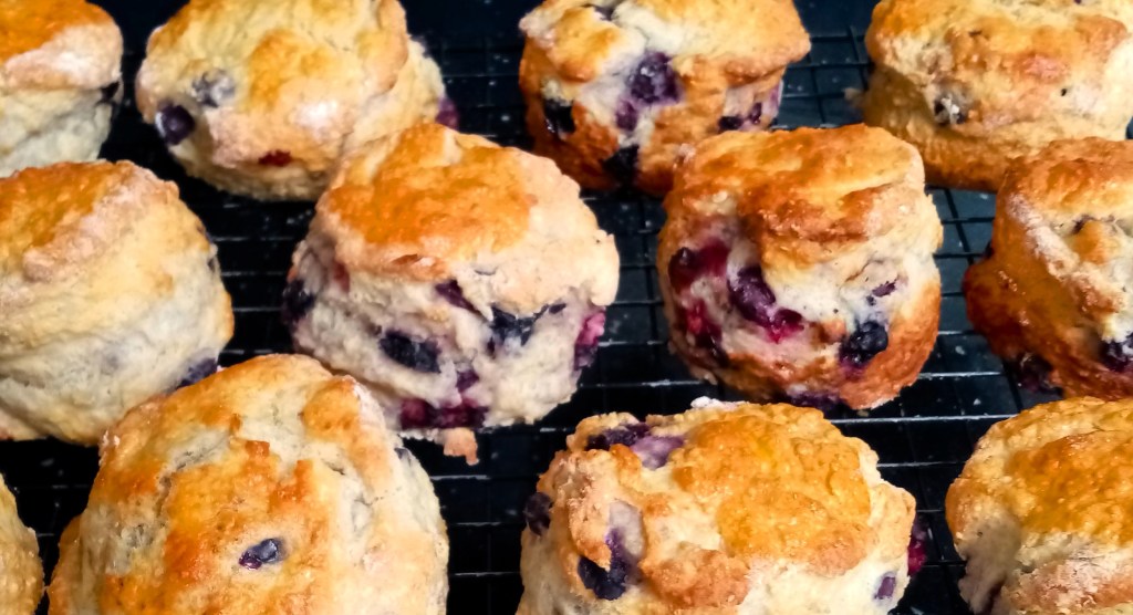 I like using blueberries. I love the way their colour bleeds into any mixture giving a marbled or stained effect. They also bring moisture and have a nice flavour, but they sometimes benefit from an accompanying ingredient. I’ve often paired them with lemon or white chocolate. But in these scones, they “go solo” and they’re fine: colour, texture, flavour; they tick all the boxes.