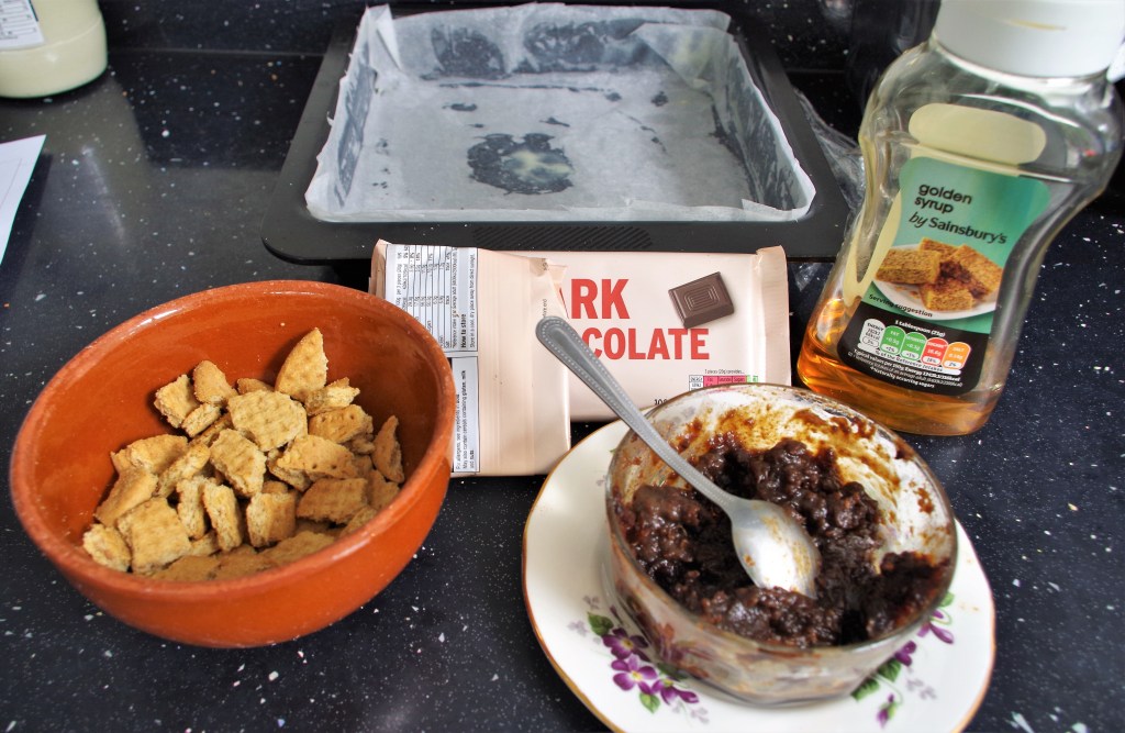 2. Put the chocolate into a bain marie on a low heat. While the chocolate is melting, put the butter, sugars and golden syrup into a large saucepan and gently melt. Stir well to make sure all the sugar dissolves.