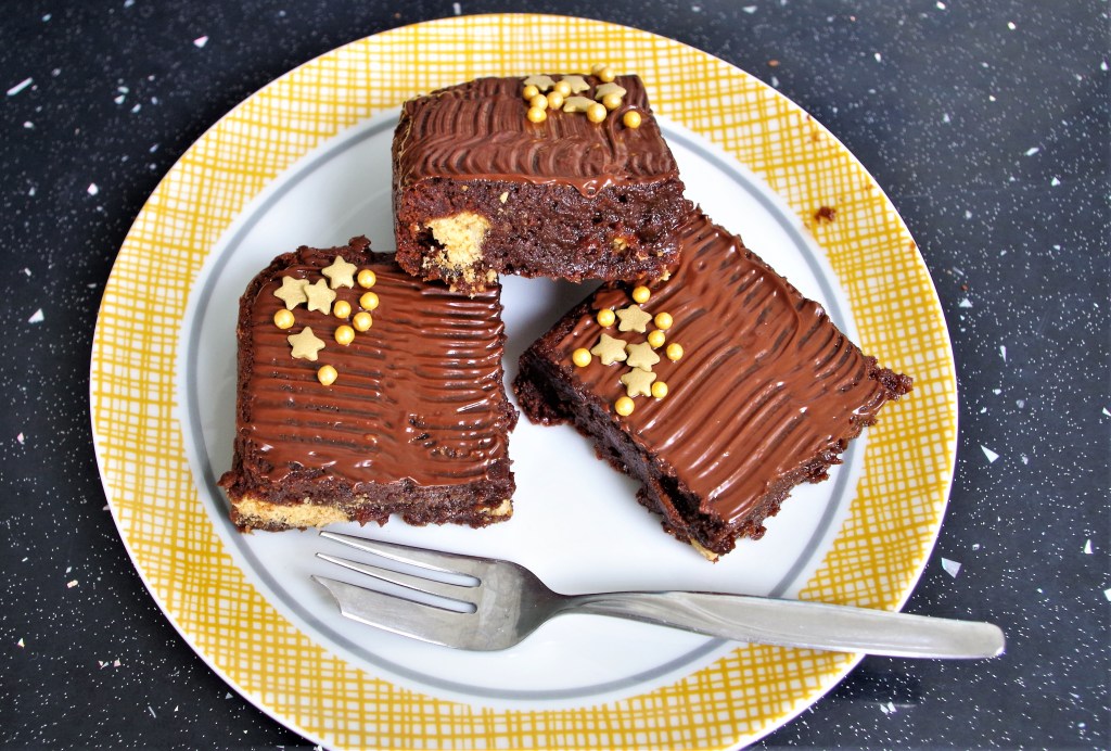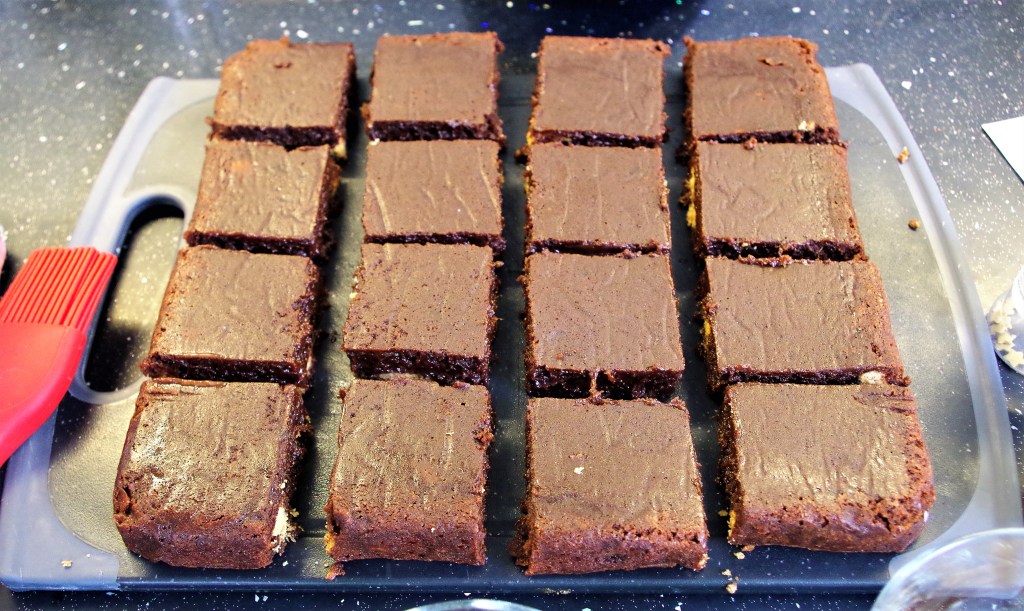 8. For the optional decoration, melt the chocolate and butter together over a bain marie then brush this over the surface of the brownies. (You may need to invert the brownies to use the flatter surface.) Add any sprinkles or just leave well alone.