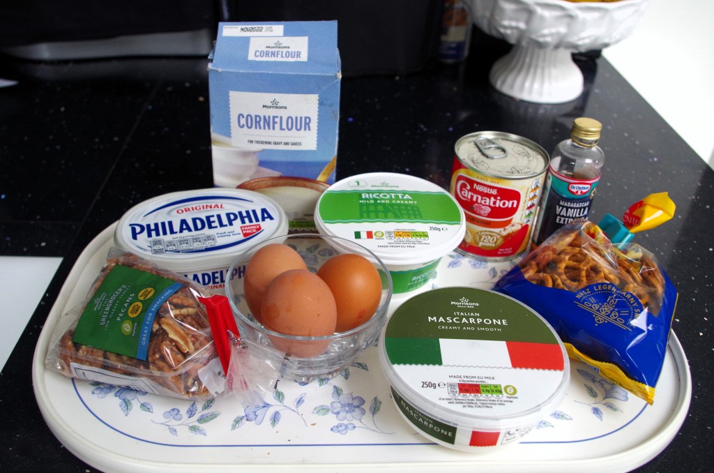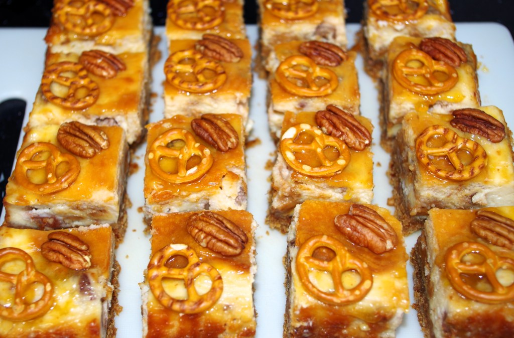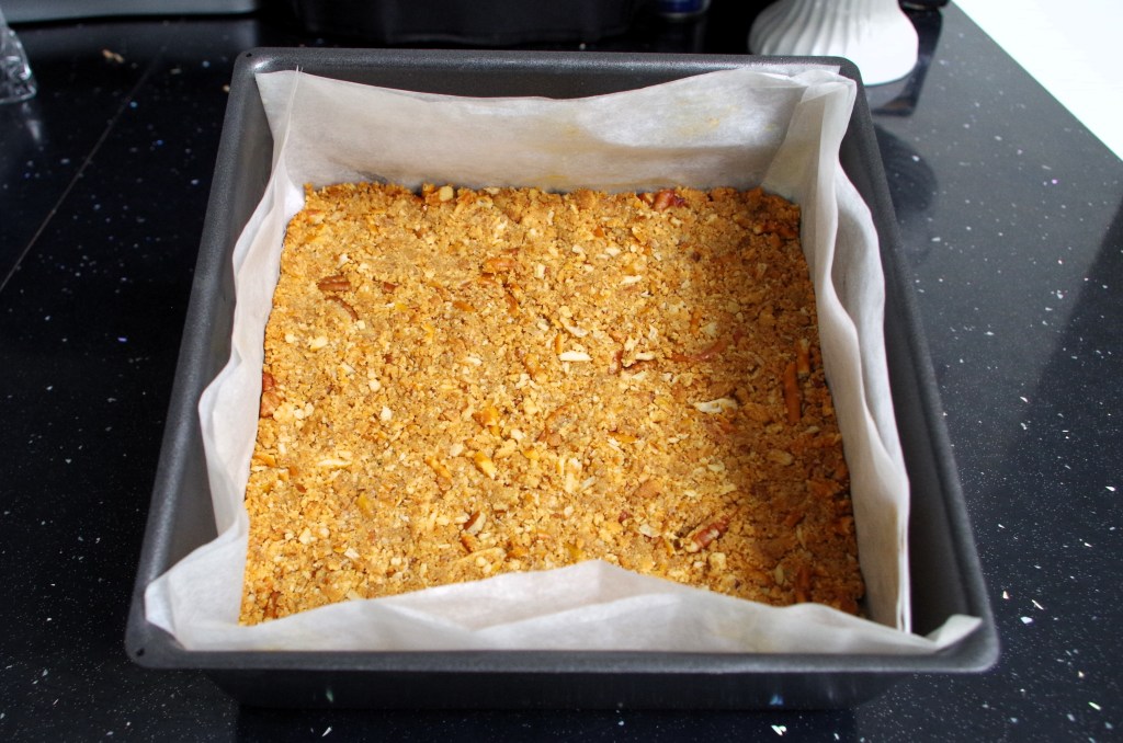 Having made lots of nice circular cheesecakes over the years, I recently I chose to make one in a 20 x 20cm baking tray. My Tray-baked Vanilla Cheesecake came out really well and was very popular, so a couple of days ago I decided to make a different version. I wanted something rich and gooey – caramel immediately came to mind. I love pecans, so they had to be included for a bit of crunch. But it could be oversweet, I thought. How could I balance it? The answer was to include slightly salted mini pretzels.