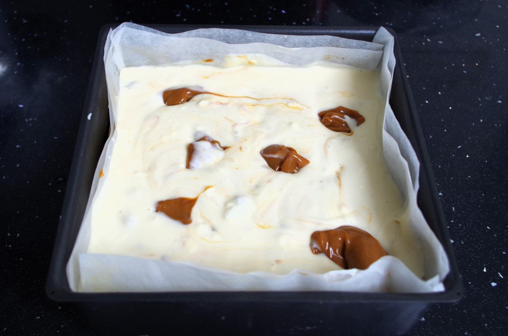 6. Spoon or pour the mixture into the prepared tin and smooth the top. Drizzle or dollop over some caramel and stir to marble. Tap the baking tray a couple of times on your work surface to release any air pockets.