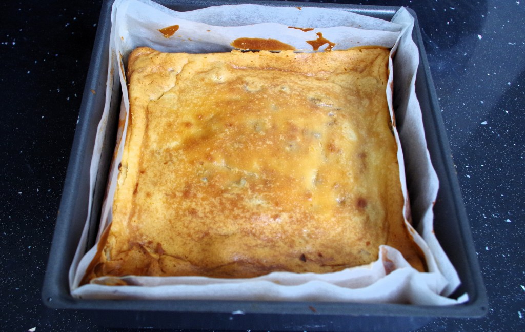 Now, before you rush out and buy the ingredients and start baking this tempting treat, a word of caution. The proportions of my original cheesecake tray bake were near perfect, but this latter one – also baked in a 20 x 20cm tin – has produced quite large pieces. For me, that’s far from being a problem, but I’m now wondering whether the ingredients below would work as well in a 30 x 20cm tray. I’ll give the ingredients and times for the 20 x 20cm version and a few tips in case you want to go 30 x 20cm. OK?