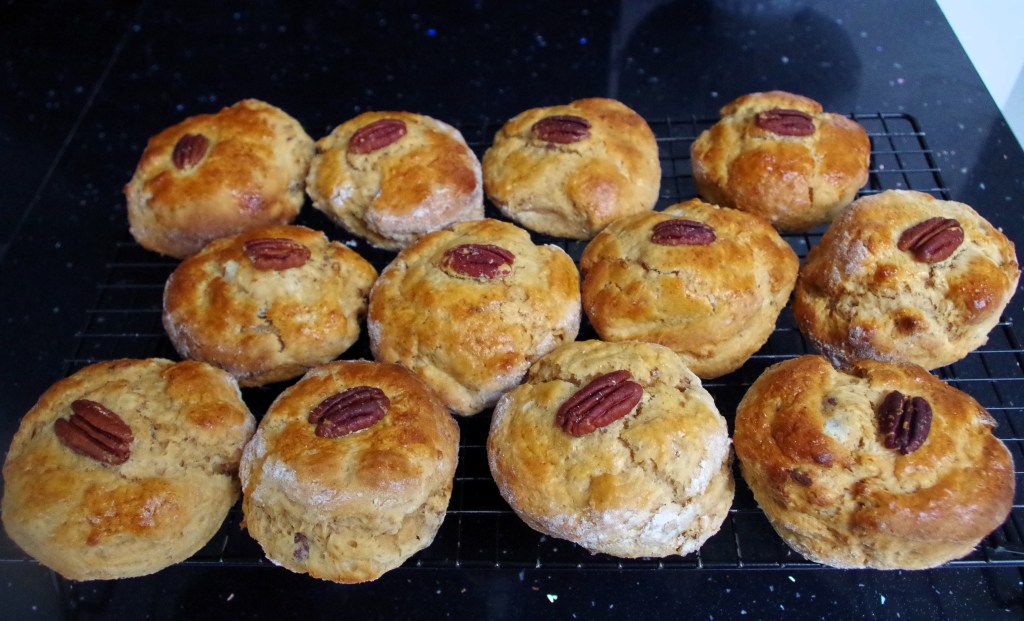 Recently, I fancied making few sweet scones; some for home consumption and some to give to friends. I’d just made a Caramel Pecan Brownie Cake and had some extra caramel and plenty of pecans left over, so I put them to good use, making these delicious scones.