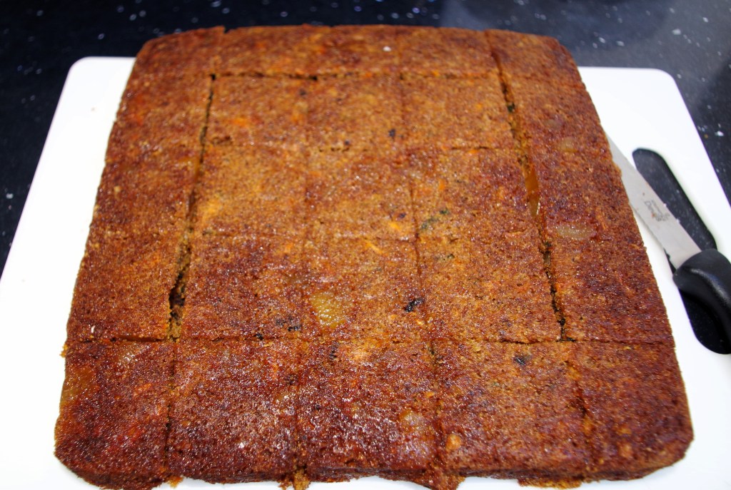 6. Remove from the oven and leave to cool in the tin. Remove and cut when ready.