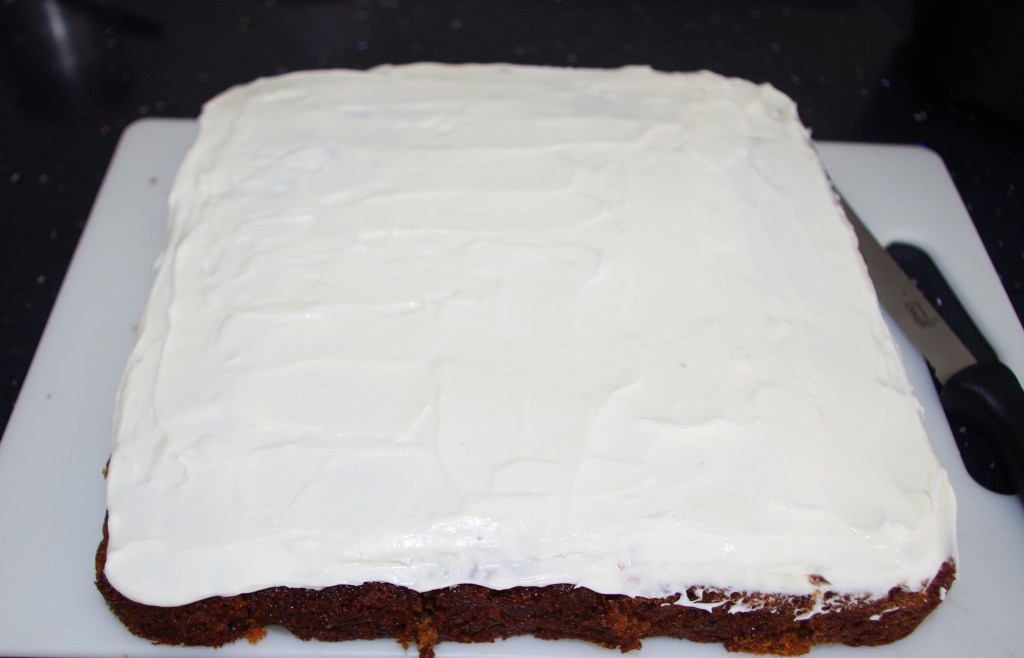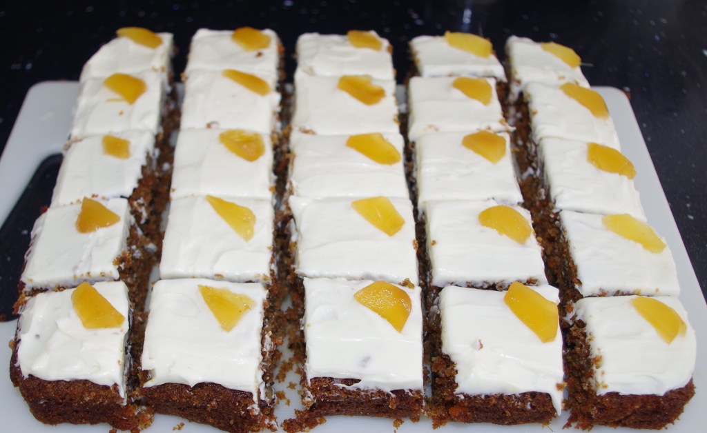 NB2 I cut my “block” of baked cake before adding the topping. I then located the cuts and cut through again. I had a vague feeling that this might be a good idea, but in the end it probably wasn’t. It’s up to you, but next time I’ll put the topping on then cut it into pieces.