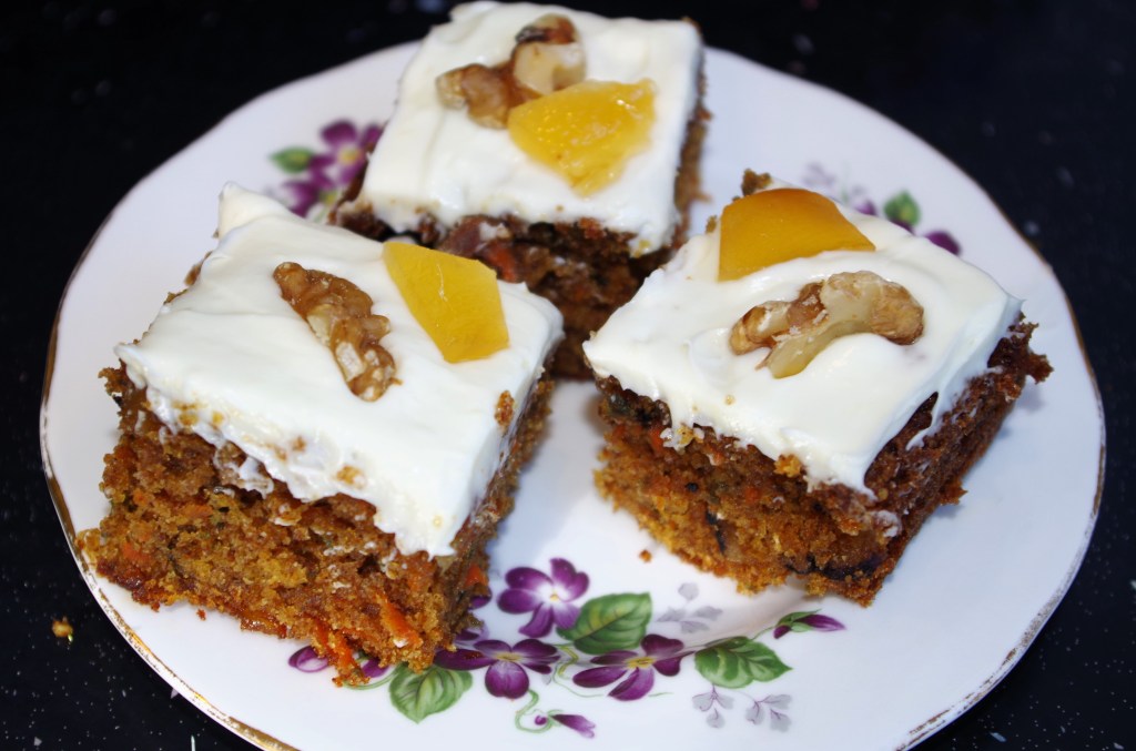 1. Grease and line the tin. Turn the oven on to reach 190°C / fan 170°C / 375°F / Gas mark 5. Wash and grate the carrots, cover and set aside. Chop the walnuts & stem ginger.